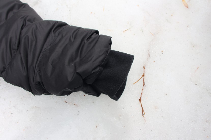 The fleece-lined torso offers instant warmth while your body works to warm up the air pockets in the down. It also keeps your back warm when the down is compressed, like when you're leaning back on a bench. Unfortunately, there's no fleece around your bum. When you sit on the jacket and compress the down, you lose warmth. On the plus side, while our bum and hamstrings got chilly, our quads were happy as could be.