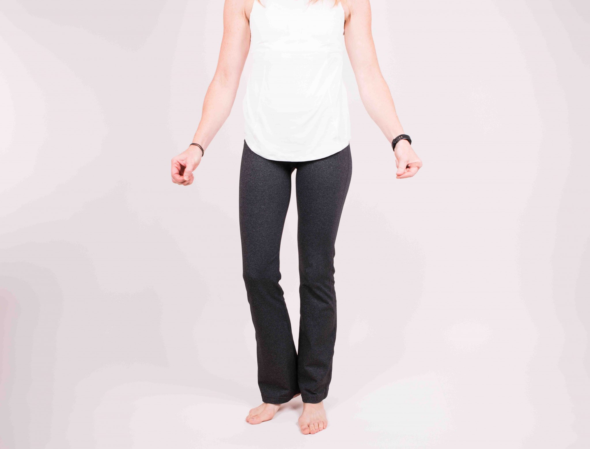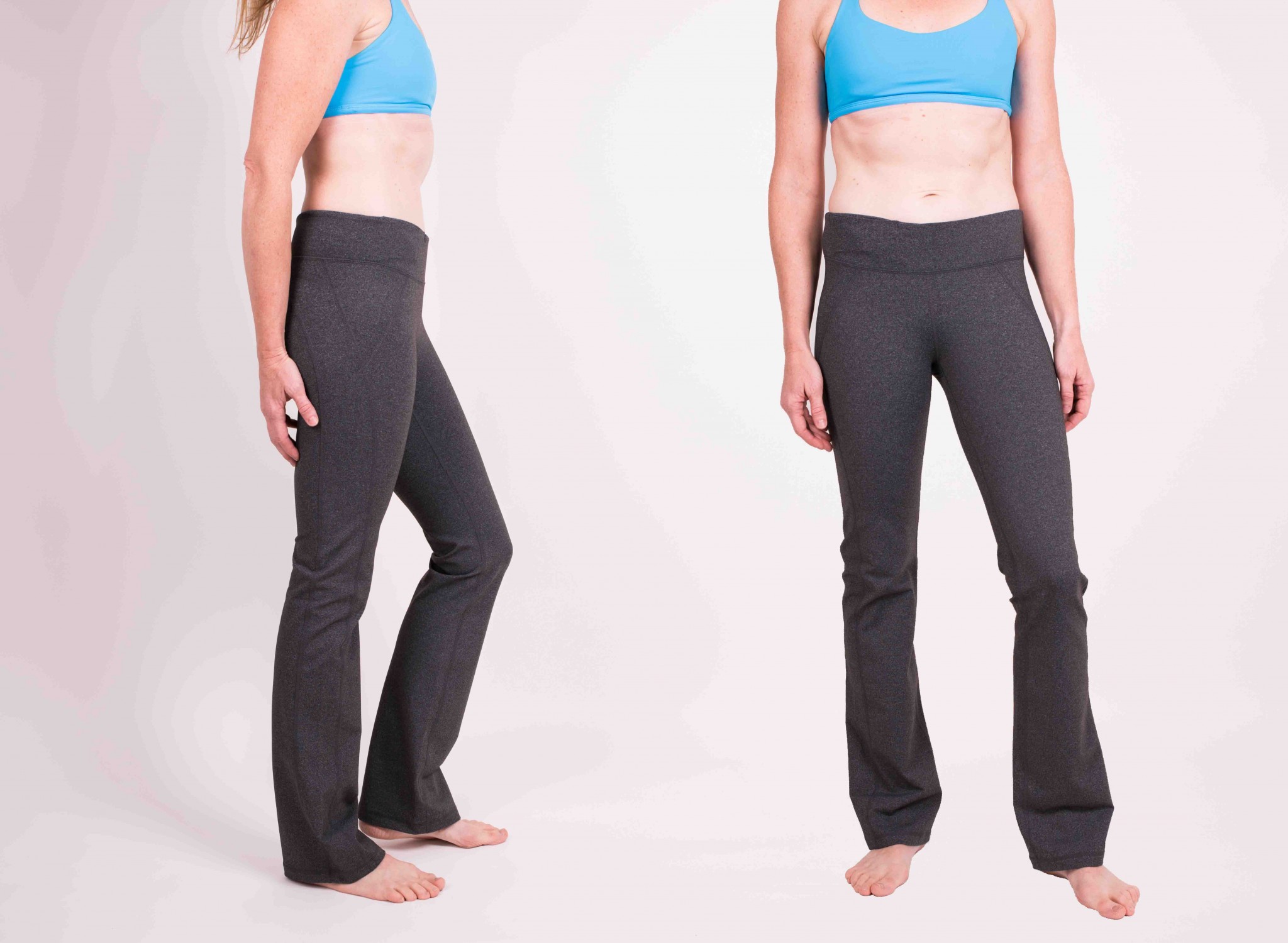 This pant did not score too well for ease of movement either. The double waistband means that there is extra fabric in your waist area that can impede forward bends. The material is on the compressive side, which we liked for keeping everything uplifted, but that also impeded our movement somewhat. Finally, the boot cut fit means there is always an extra flap of material hanging around your lower leg, which can be annoying when doing inversions or even just stepping through into Warrior I.
