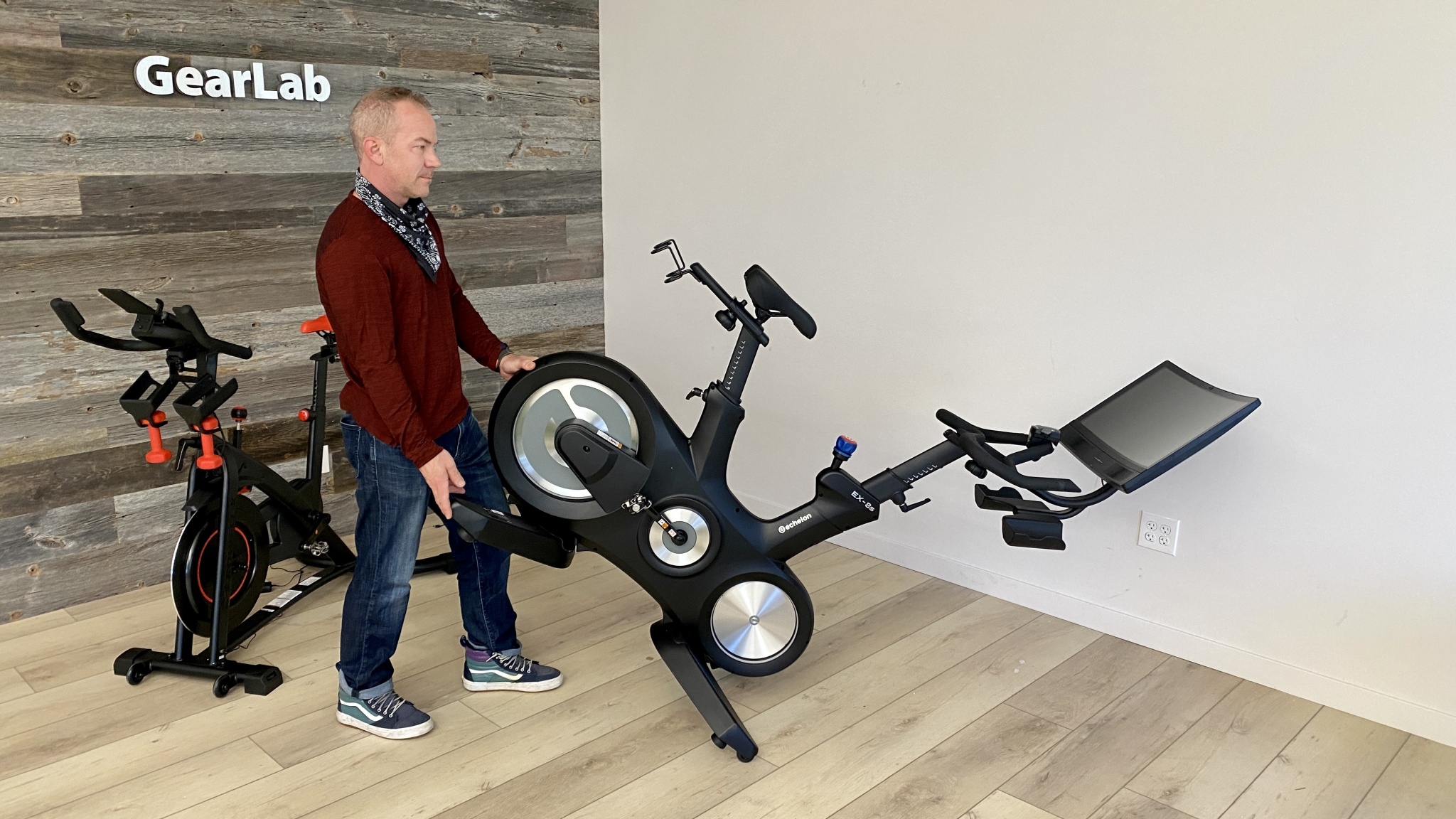 Even with its massive screen, the EX-8s isn't much larger than most of the other bikes we tested; its footprint measures 22 inches wide x 56 inches long and a height of 64 inches at the top of the touchscreen. To use the screen for non-cycling workouts, you'll need several feet in front of its 56" length. The bike has a claimed weight of 124 lbs, which comes in less than other high-end bikes in its class, but it's certainly not light. Moving the EX-8s around on smooth flooring is possible thanks to the integrated transport wheels that allow you to roll it when tipped forward, but tipping it far enough to engage the wheels extends its effective length to about 7' due to the height of the screen.