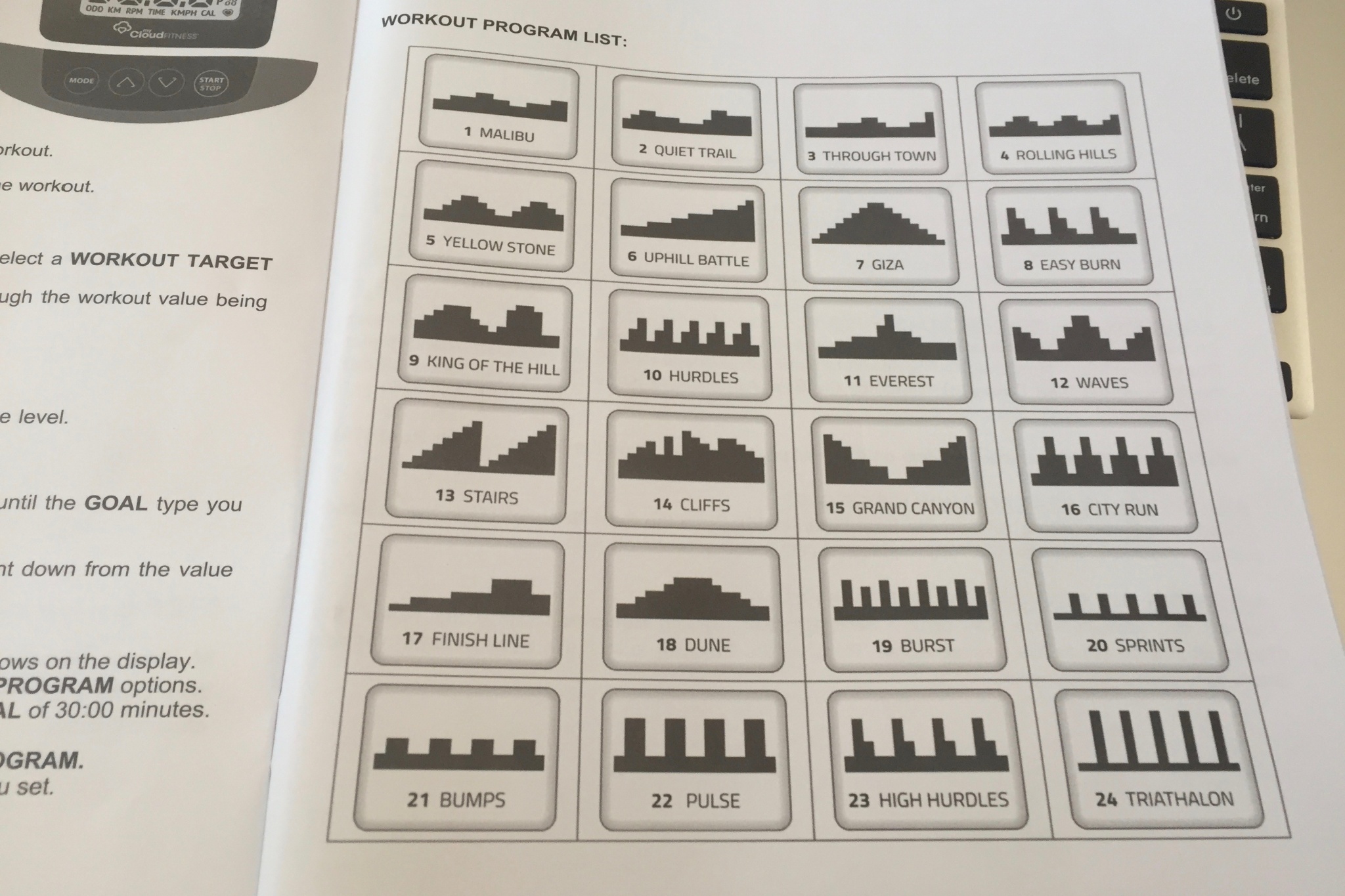 The 2.25" wide x 1.125" tall LCD display is located front and center in the desk and is inset in the wrist pad. This small display has relatively large numbers that are quite easy to read, and it displays one piece of information at a time. Scan is the default setting, and it scrolls through time, speed, distance, calories, odometer, resistance level, and RPM. There are four buttons below the screen, start/stop, mode, and up and down arrows. The start/stop button is used to begin a Quickstart manual workout, to Pause and Restart a workout, or to Reset the values of the metrics (press and hold for 4 seconds). Before starting a workout, the Mode button can set a workout target goal (distance, time, or calories) or select one of the twenty pre-programmed workouts. During your workout, you can use the Mode button to select the information displayed on the screen. The up and down arrows are used to select a workout target goal value, scroll through the 24 workout programs, or adjust the resistance level during a workout. All pre-programmed workouts are on page 20 of the user manual; we suggest keeping this page for reference as the small screen only displays the number of the program. It does not show the program name, course profile, or progress during the workout.