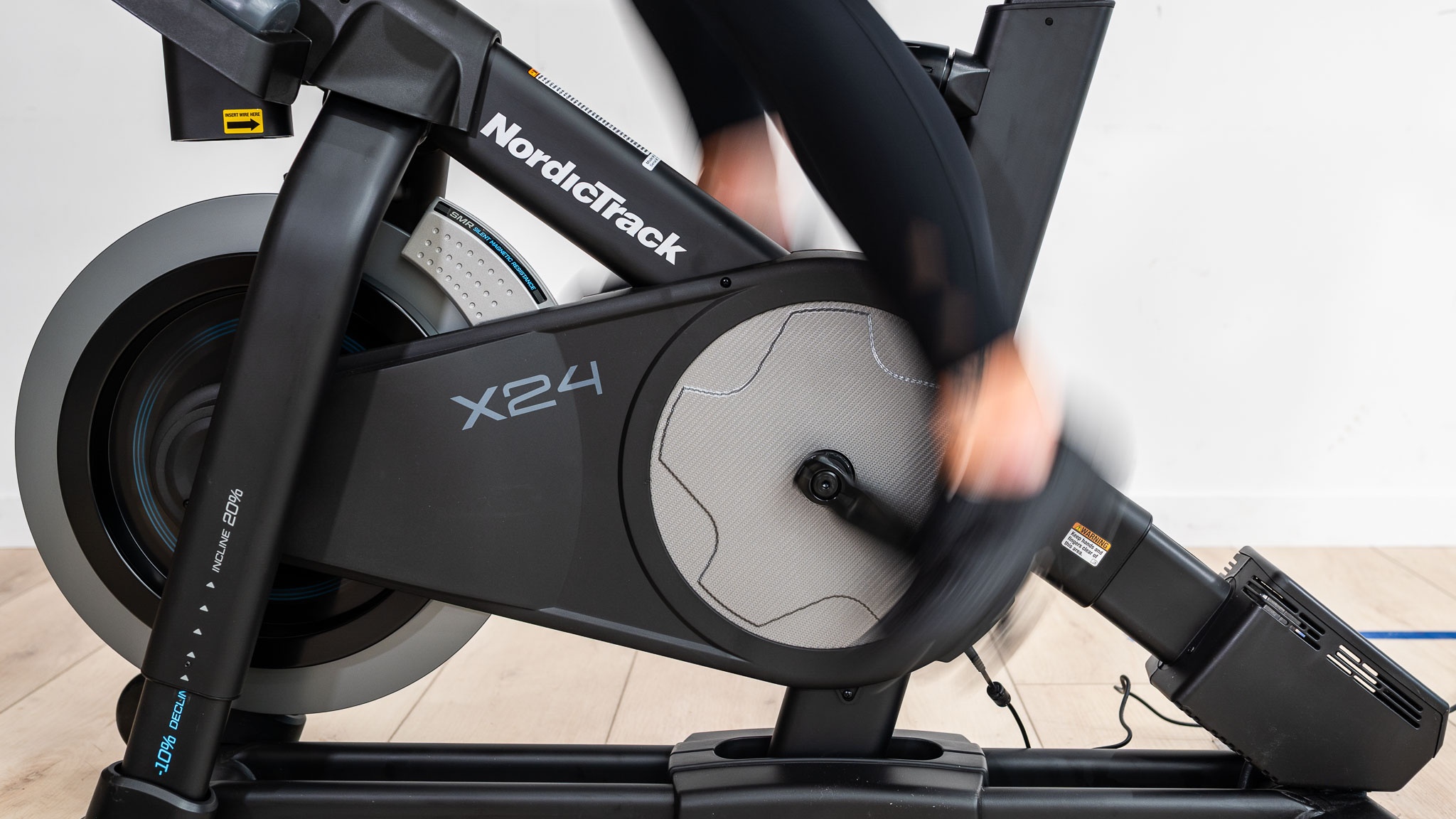 The NordicTrack X24 is a well-rounded spin bike that stands out with its unique incline ability. Not only does the bike raise and lower to mimic riding hills, but those adjustments happen automatically when riding an iFit workout. The bike is fairly conventional in layout with a forward mounted 32 lb flywheel that uses (SMR) silent magnetic resistance to create your virtual headwind. Turning the resistance up or down on a normal spin bike increases the effort required to turn the pedals, but unlike a real bike, your body position doesn't change. When you climb a hill on a real bike, the front end is raised, relaxing the seat tube angle and moving some of those efforts from your quadriceps into your hamstrings. This is what happens on the X24 that sets it apart from other spin bikes and helps you feel not only more challenged, but more engaged. The X24 replaces the S22i and builds upon its success with an updated screen and electronics.