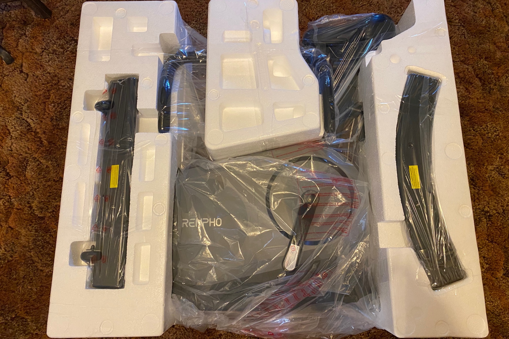 Renpho has printed some helpful unboxing instructions on the outside of the box. These simple instructions include opening the top of the box, rolling it so that the open side of the box is down, sliding the box up and off the top, then laying the bike down on its side. Our bike arrived in perfect condition thanks to very secure protective packing materials. Removing the bike and its parts from the styrofoam is straightforward, and it comes with detailed printed assembly instructions and all the tools required to finish the job at home. The remaining steps include attaching the front and rear stabilizers, connecting the internal power cord, mounting the handlebar, and installing the pedals and pedal straps. Pay close attention when attaching the pedals as the left pedal threads are counter-clockwise while the right pedal threads are clockwise (the same goes for all pedals). After that, you'll need to make some adjustments to handlebar height, seat height, seat fore/aft position, and potentially the levelers on the bottom of the front and rear stabilizers.