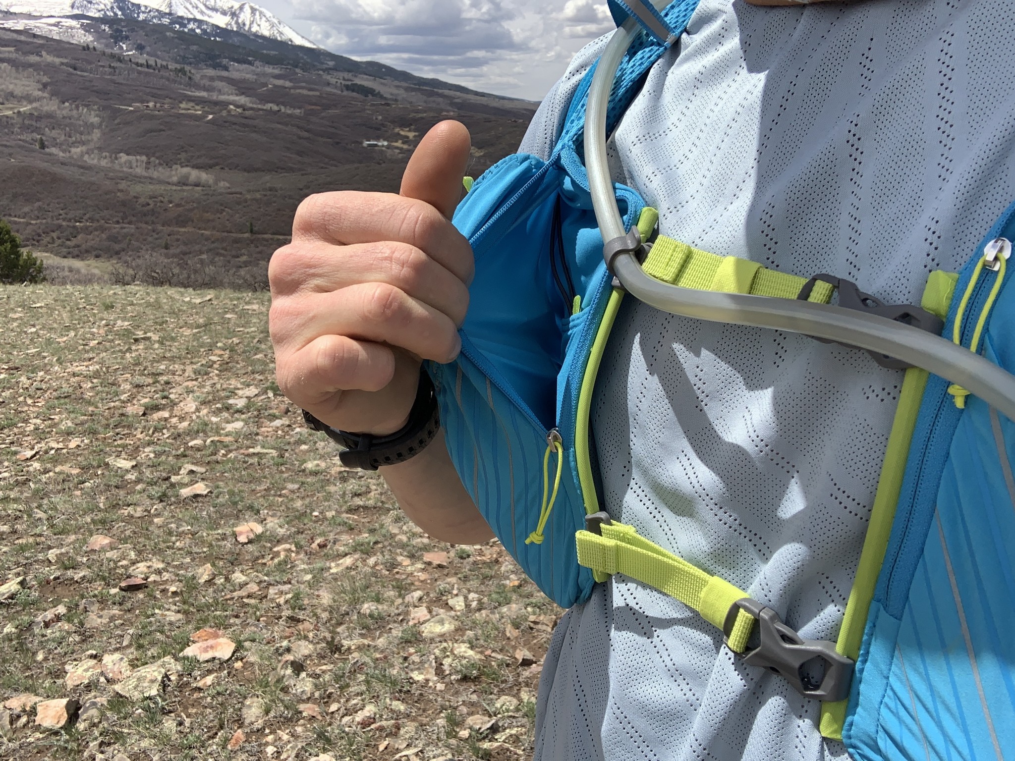 Fortunately, the Pinnacle 12 showcases a lightweight premium bladder and hose system that can be filled with one hand and has never leaked on us. The clever hourglass shape of the bladder worked well with the longer vest design and prevented unwanted sloshing. Routing between fabric layers over the shoulder and under a loop provides comfortable hose management, and a magnetic clip keeps the hose stowed instead of flapping about. We still tucked the hose into the left lower pouch pocket for further security.
