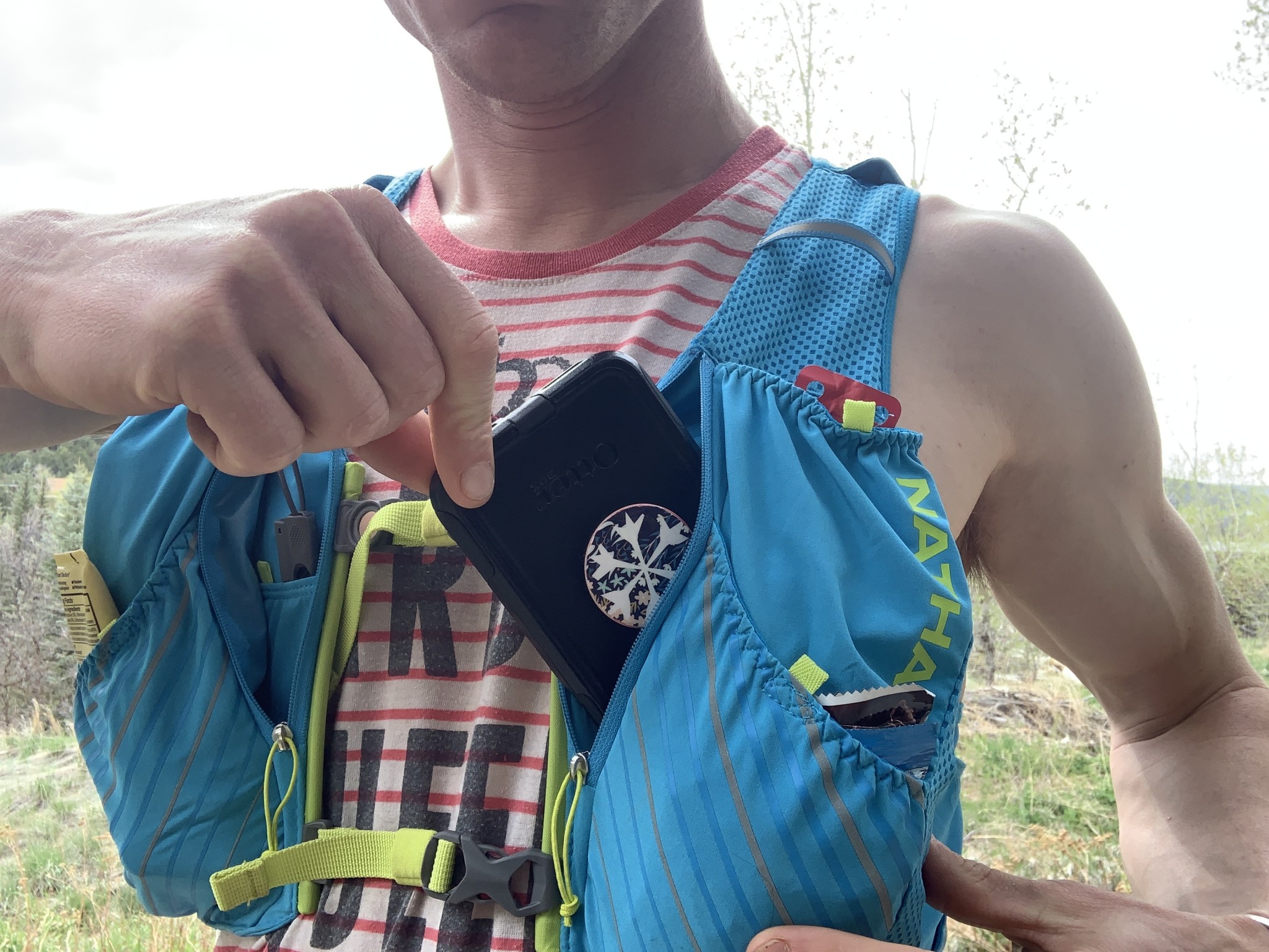 Behind the front pouch pockets on each shoulder strap are waterproof zippered pockets that can fit an oversized phone; the right one contains a pill pouch and a storm whistle. Additionally, the Pinnacle incorporates two different materials on the back panel: one where the hydration bladder sits against the back and a different, more breathable mesh along the sides of the back. Whether you choose to use soft flasks or the included 1.6L bladder, the pocket design paired with the feature set can comfortably carry enough water and gear for a 100-mile race.