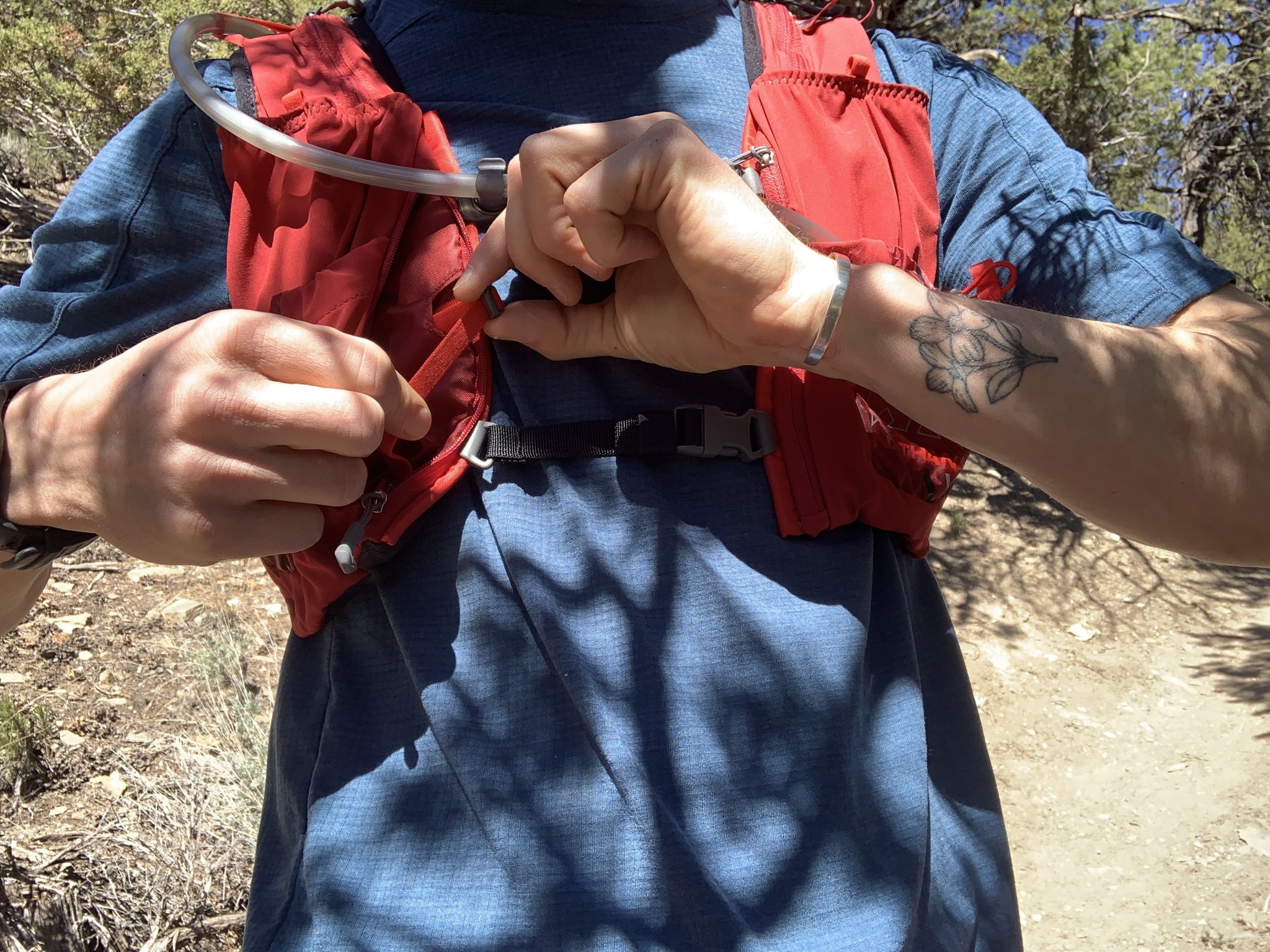 When pulling either side of the adjustment strap, which is located inside a pocket (meaning it's nearly impossible to adjust while moving or if you have things in the pockets), you don't feel the strap becoming snug until you pull an excessive amount. The result for us was a less than perfect fit, as well as some frustration with the design. Throughout our testing, we found that vests with hydration packs require large easy to adjust v-straps along the flank to keep the pack from bouncing all over.