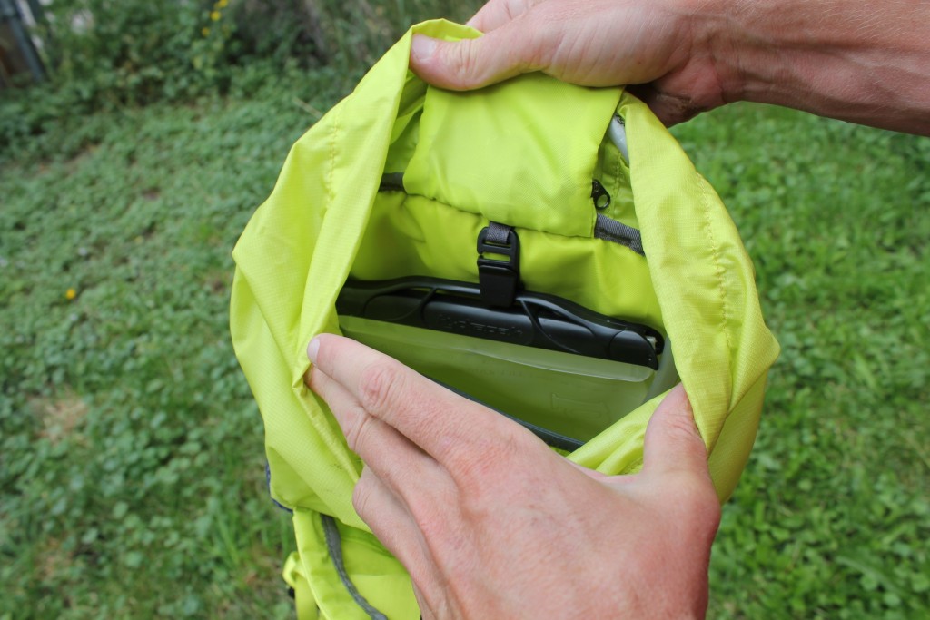 By far our biggest complaint with the Fore Runner Vest is the hydration system. Like the Nathan VaporAir, it uses a Hydrapak bladder, which we like. This bladder folds over at the top and is closed by a slide-on sleeve that pinches the opening closed. However, in our experience, the hose is much too long and the single clip on the shoulder strap to hold the hose and nozzle while running is bafflingly placed where it is almost unusable. The end result is that you have a whole lot of hose flapping all over the place while you are running, something all of the other packs were easily able to address. Also, while Patagonia claims the front pockets are stretchy and big enough to hold bottles or flasks, this is simply not the case.
