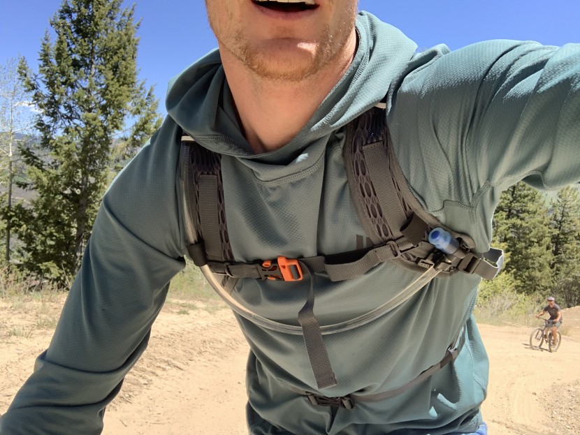The lower chest strap (or is it a waist strap?) strikes directly across the diaphragm, making it difficult to get a comfortable, secure fit without seriously impacting the ability to breathe while moving. This limiting factor makes the vest unacceptable for running, an activity prone to jostling. We often use the word suspension to talk about bounce and designs to remedy it. It's fair to say that this pack has no suspension. We found it best for lower intensity activities such as biking and hiking, and we made sure to keep the lower strap looser.