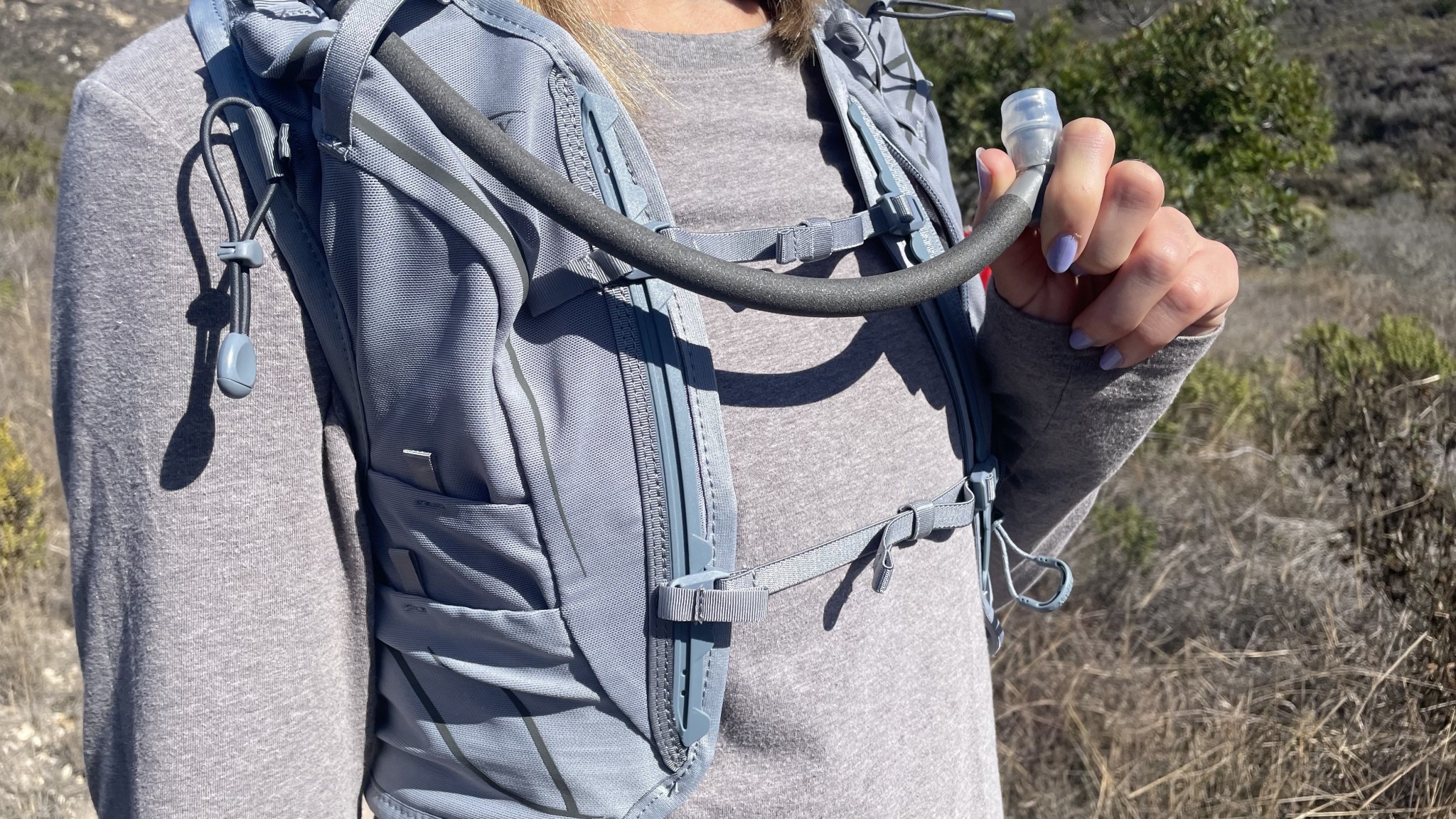 Osprey offers two size options for this hydration pack: XS/S and S/M. The flexible sizing can be fine-tuned through the multiple cinch straps, which help ensure a customized fit. The under-arm straps are basic, but they add one more layer of adjustability, and we love the option to snuggle the vest a little tighter on days when we wear fewer layers. The front closures are highly customizable cinch straps that work well — once you know how to use them. There is a plastic piece of ribbing with seven teeth on it that runs the length of each chest panel on the vest. There are two straps, each with bilateral clips that hug the spaces between the teeth on the ribbing, and the teeth ensure that the clips do not move while in motion. This system as a whole helps keep the vest in place while running extremely technical terrain, and works quite well once you get the hang of it. Since the closures are mirror images of each other, you can choose if you'd like to open and close on the left or right side. It's so seamless that you can decide on the go if that's what makes you happy. And don't worry about chafing, this oddly designed yet profoundly functional ribbing is secured an inch from the front edges of the vest.