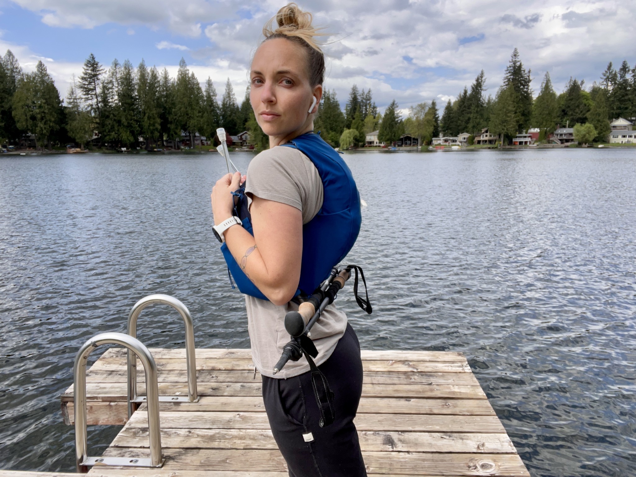 This vest comes equipped with multiple movable elastic loops and cords that can be used in a variety of different ways. One of the most useful ways, in our opinion, is to configure the loops to pack your trekking poles. We love how customizable this is.