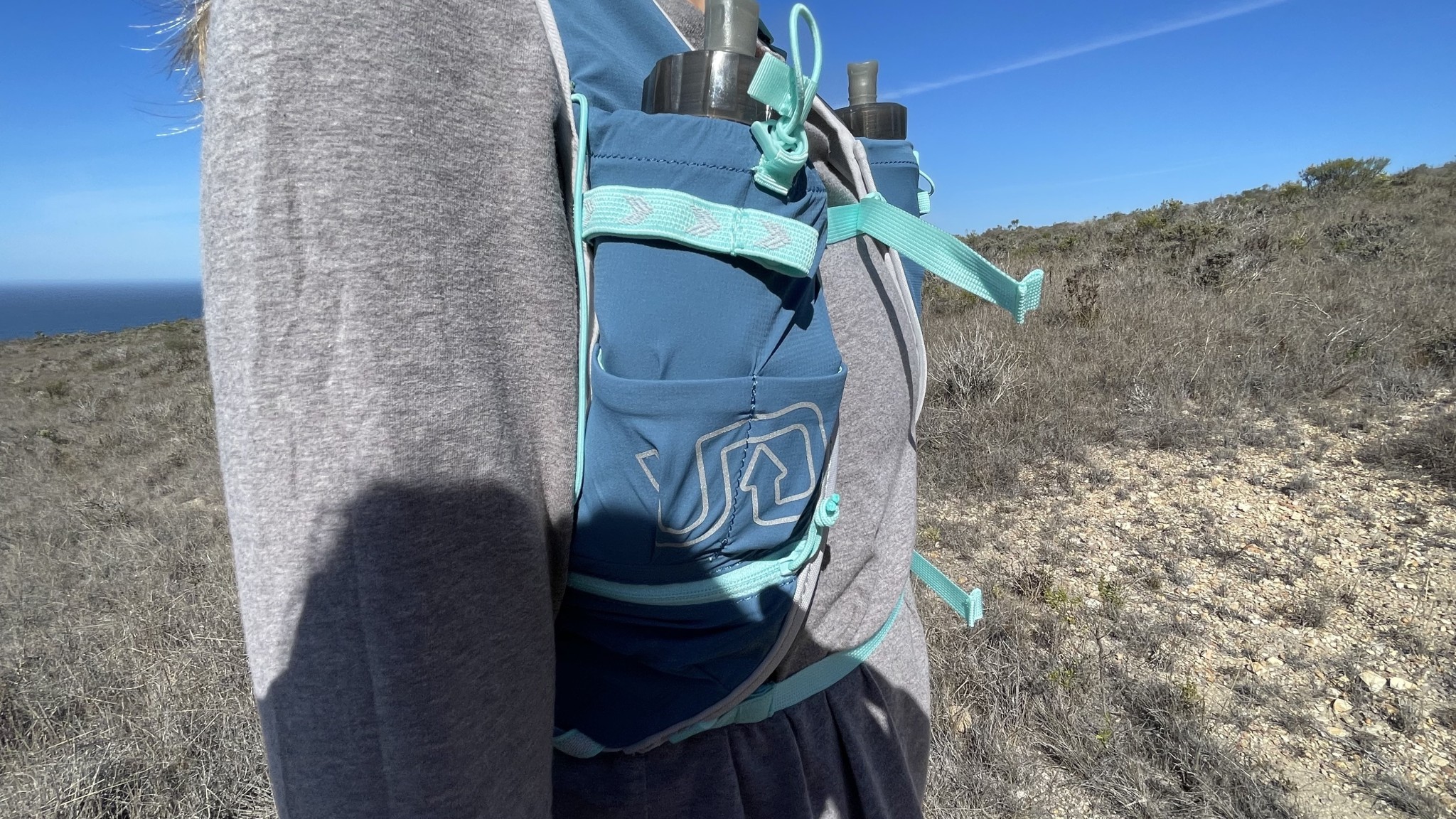 The flasks ride a bit higher than in other vests, making them more accessible while you run — we like the placement of the flask pockets a lot. The large back pocket of the pack can easily accommodate a 2-liter hydration bladder. We ran a few testing runs with a full hydration bladder and found that we prefer using the soft flasks instead. Using the bladder wasn't uncomfortable, thanks in part to the loop at the top of the back pocket that allows you to secure it in place — we simply preferred the flasks over the bladder. Much like with other hydration vests made by Ultimate Direction, the Mountain Vesta is an epic choice if you want to tote a ton of water on your runs. With the capacity to carry three total liters of water and a strong external compression system, this is the hydration vest to consider if your focus is on the word “hydration.”