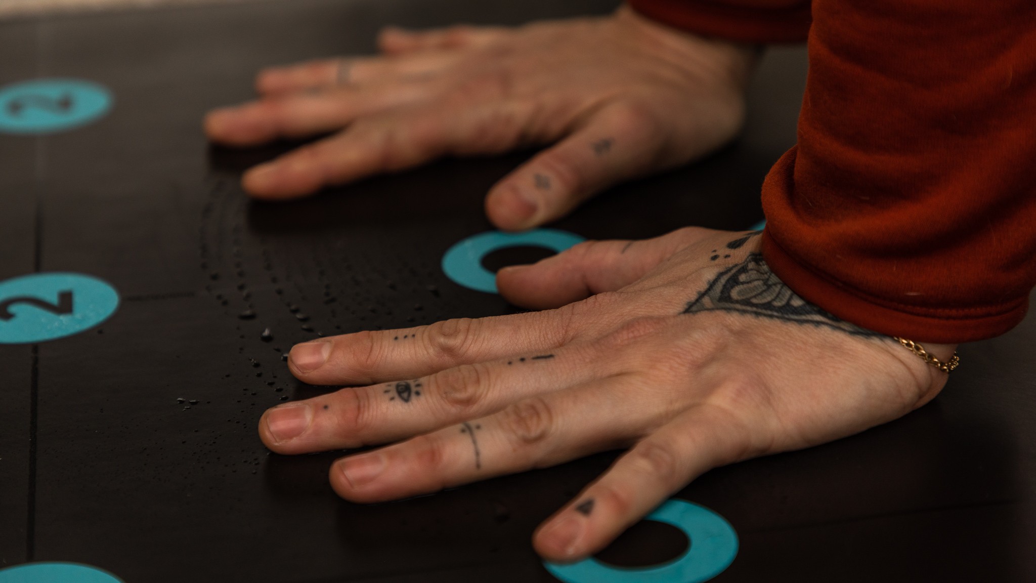 Because it's thin and firm, there isn't a lot of give or squish to the GuruGrid. This feature is nice for handstands, crow, or any other position that requires a firm foundation to keep your wrists from pushing further into the mat than the rest of your palm or fingertips.