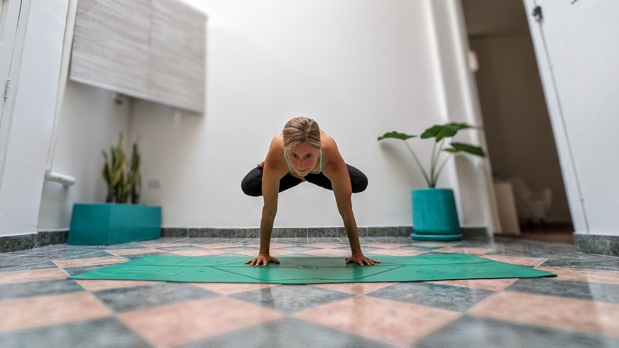 We love this mat because it is thin, supportive, and grippy enough to do yoga on various surfaces. The underside has a textured tread, like trail running shoes, that grips well on carpet, slick wood studio floors, or glassy tile. The mat tends not to budge but can wrinkle slightly in the middle when you roll over your toes in down dog if you don't engage your core.