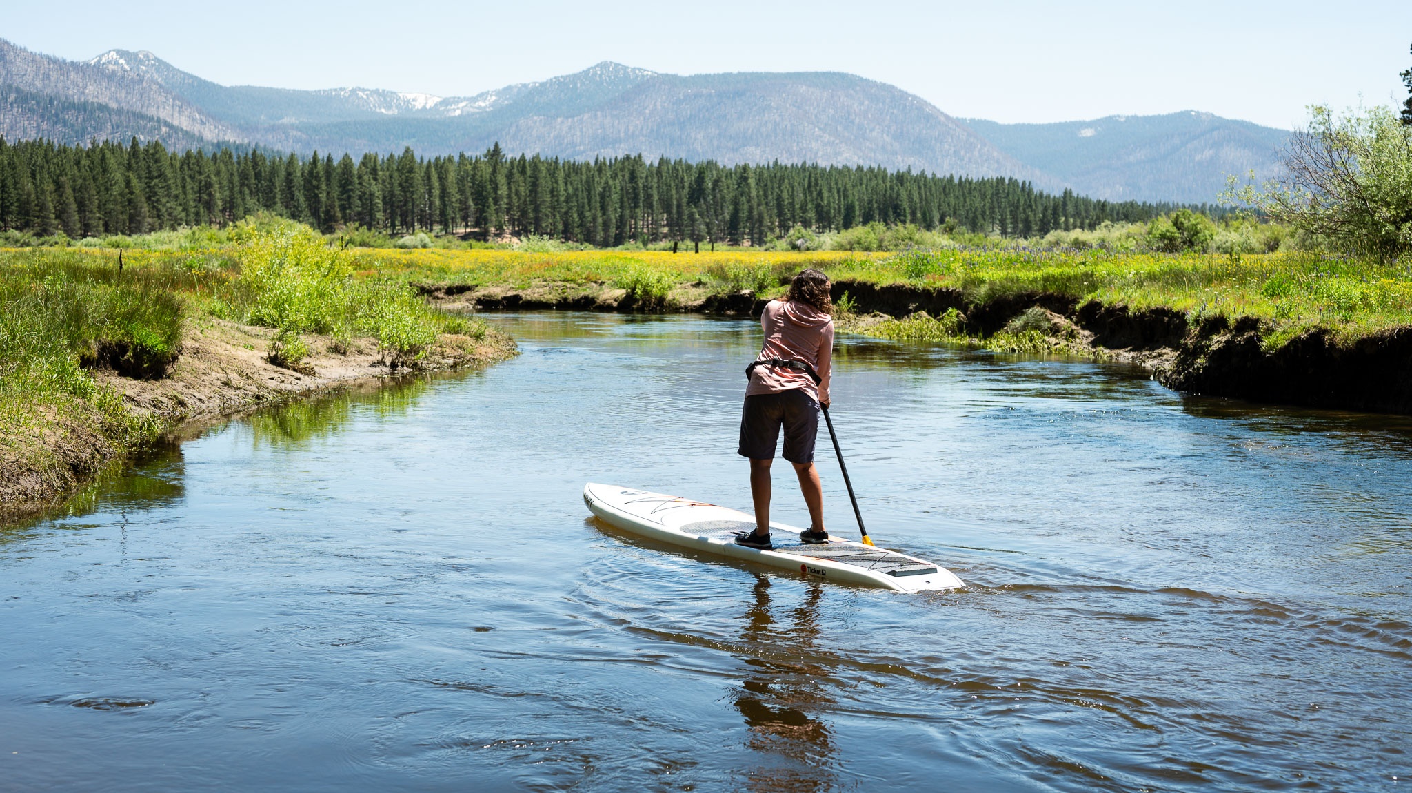 We tested the 12'6" model of the Infinity E-Ticket touring SUP, which measures 29.1 inches wide and reports a total volume of 280 liters. This well-constructed board is built with a carbon Innegra glass sandwich construction and a lowered-standing deck that is reinforced with an extra layer of carbon. The board has a foam traction pad, ample cargo net space, a single center fin setup, a plug for a board leash at the back, and an action camera leash attachment spot on the front. This design is available in four sizes ranging from 11-14 feet long.