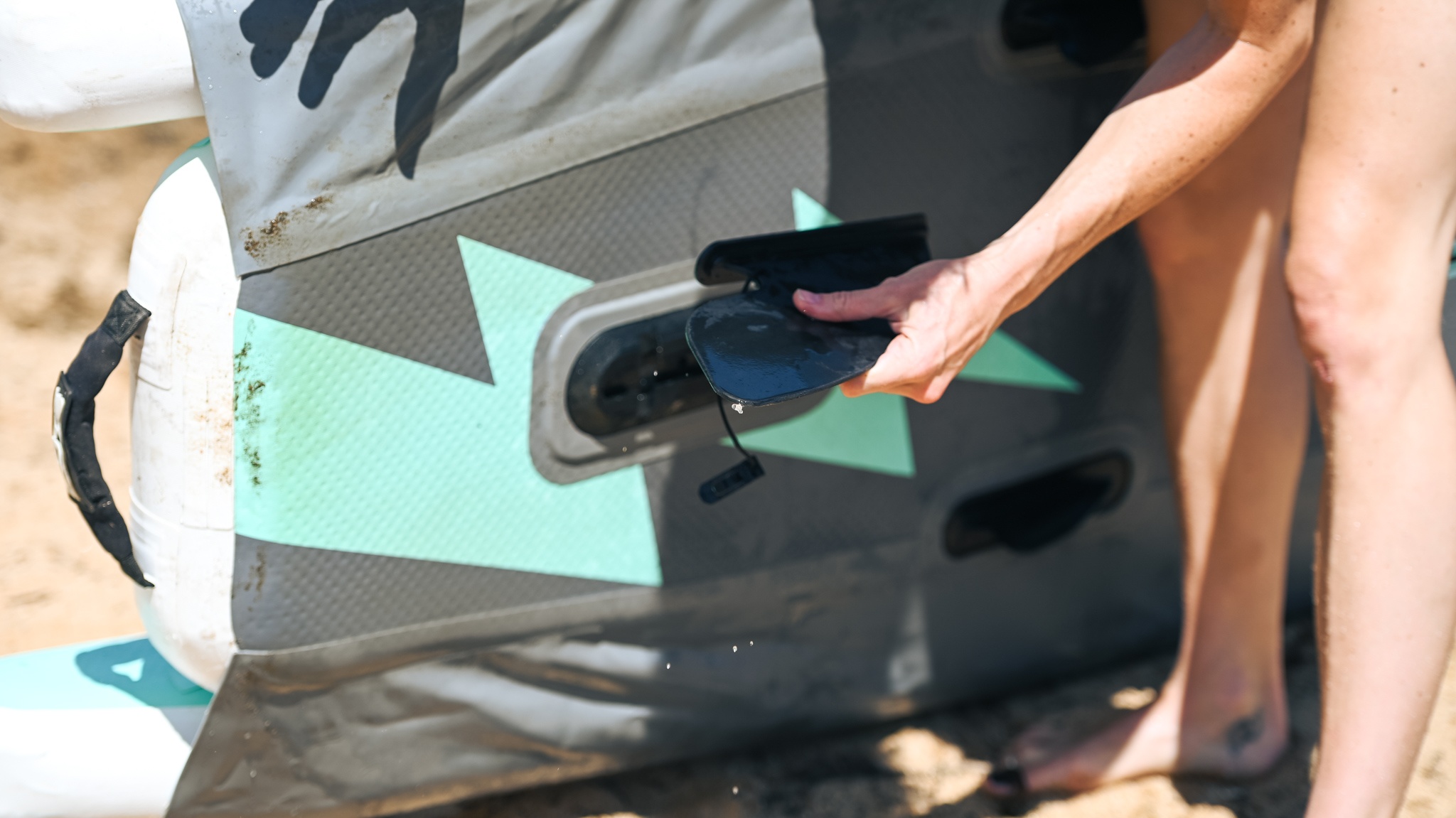 As a kayak, the Deus has five chambers to fill, two of which are seat components. The included hand pump is simple to use, though inflating to 15 PSI takes far more effort than most kayaks' low two to three-PSI requirements. Our bigger struggles came when putting the Deus away. Because the sides are so thick, we quickly learned that using the deflation side of the pump is a must for getting it to fit back into its bag. Though it has plenty of straps to condense and hold it in place, we found it challenging to fit the boat, the seat, and the pump back into the bag and zip it closed — with no extra room for a paddle. The Deus weighs a whopping 55 pounds, putting it on par with the heavy-duty tandem models we tested. We appreciate the wheels and thickly padded handles on the case, though we found they are nearly worthless in the sand and not much better on dirt trails.