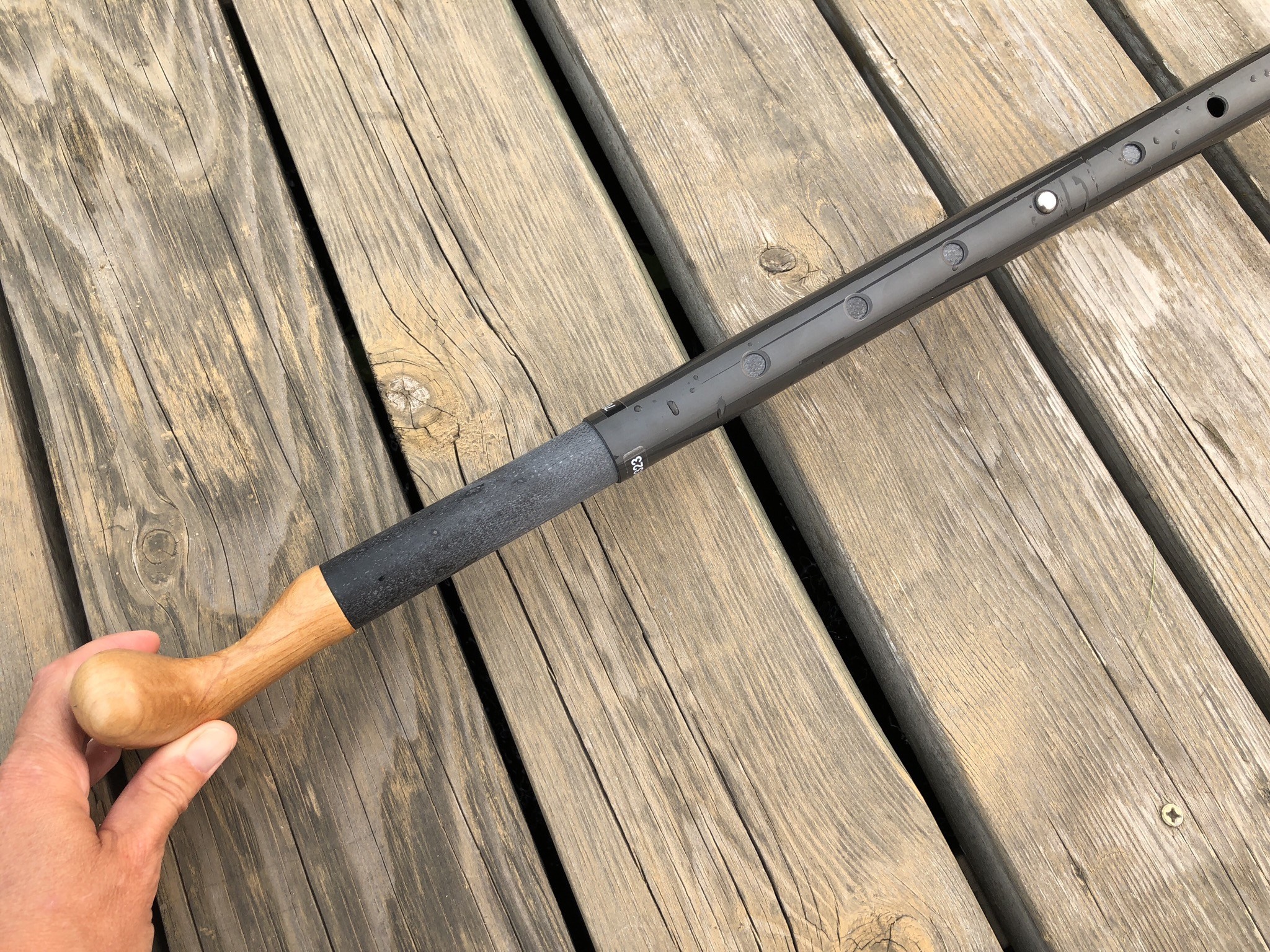 After the lucky person who reached first claimed their prize, they spent quite a bit of time admiring the craftsmanship of the blade. It features a feather pattern of basswoods and red alder. The carbon shaft looks black at first, but then you notice it seems to glow from within where the light hits it. The solid wooden grip with its asymmetric palm looks inviting to hold.