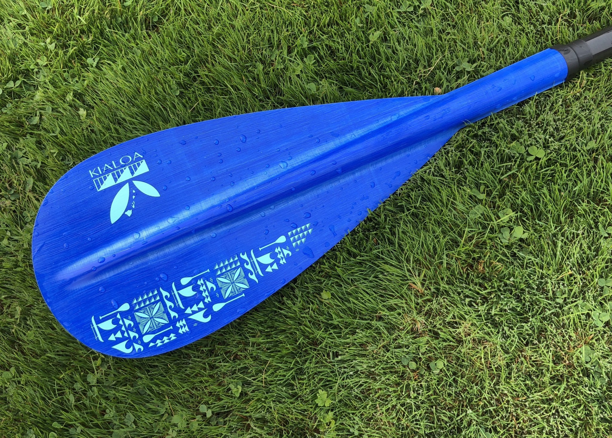 The updated Insanity is a beautiful paddle with a cool vibe. It features a matte cobalt blue blade with Hawaiian-inspired graphics and a shiny black shaft with “KIALOA” printed in a white outline.