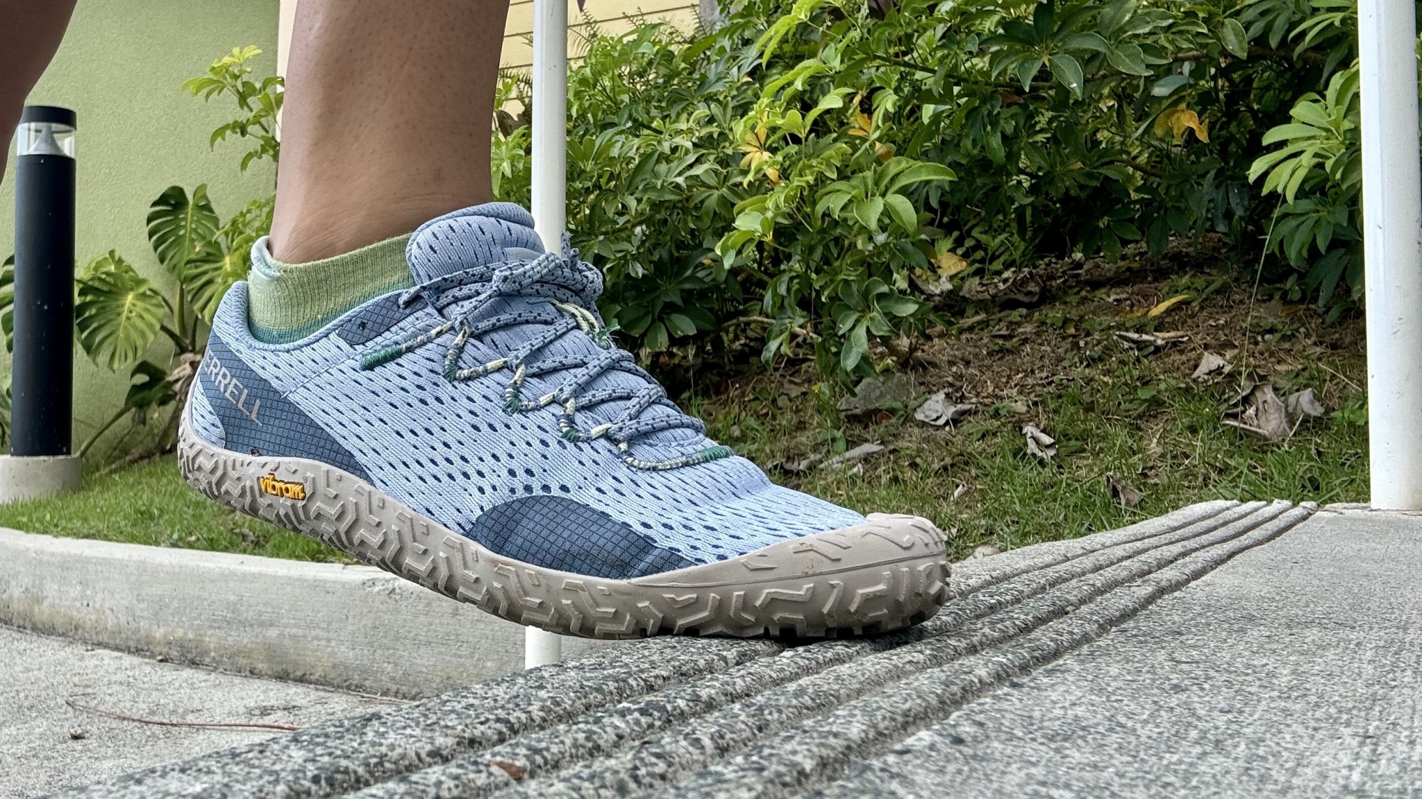 The Vapor Glove 6 is the latest iteration in a line of well-loved barefoot shoes by Merrell. These shoes are lightweight at just 10.4 ounces for a pair of US size 9. They have a small six-millimeter stack height, a wide toe box, and a flexible outsole, so we felt grounded with every step we took.