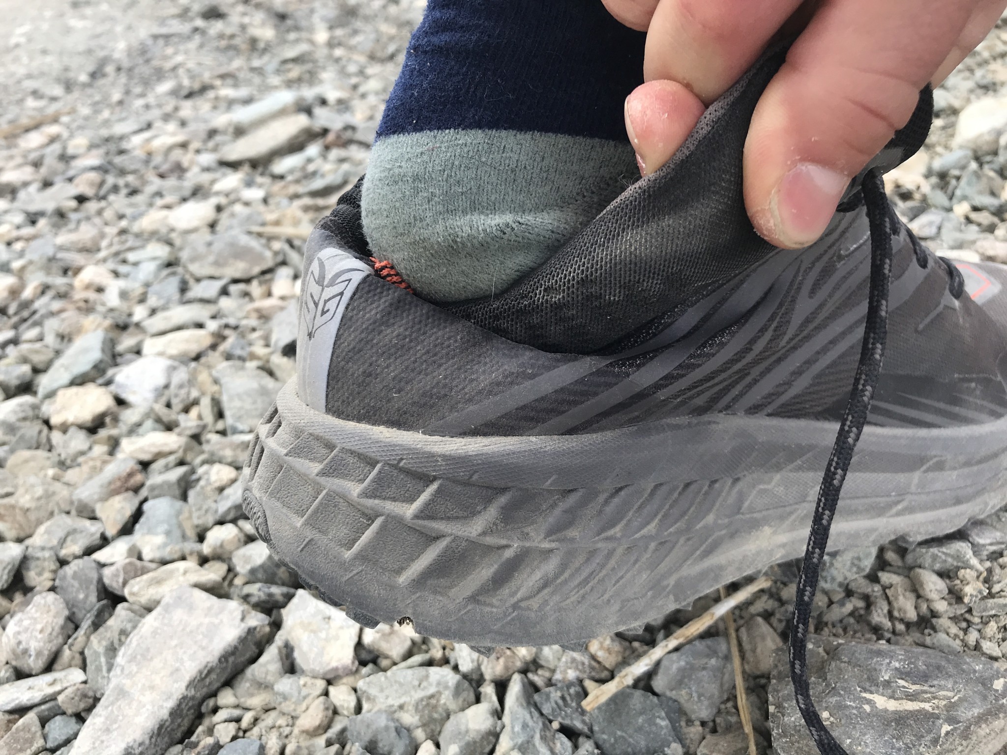 While we found that the thick sole is an overall benefit to the boot, the sole is not a uniform thickness. Instead, there are some cut-outs that likely exist to shave weight, though these make it easier for sharp rocks and other objects to poke into the footbed. This was most noticeable on rocky trails. We also notice the sharpness of the tongue at times; it is made from a stiff fabric and, with thin socks, can begin to dig into the ankle. It is also a bit snug to get the foot into, and at times we really have to pull hard on the rear loop to get our foot to slide in easily.
