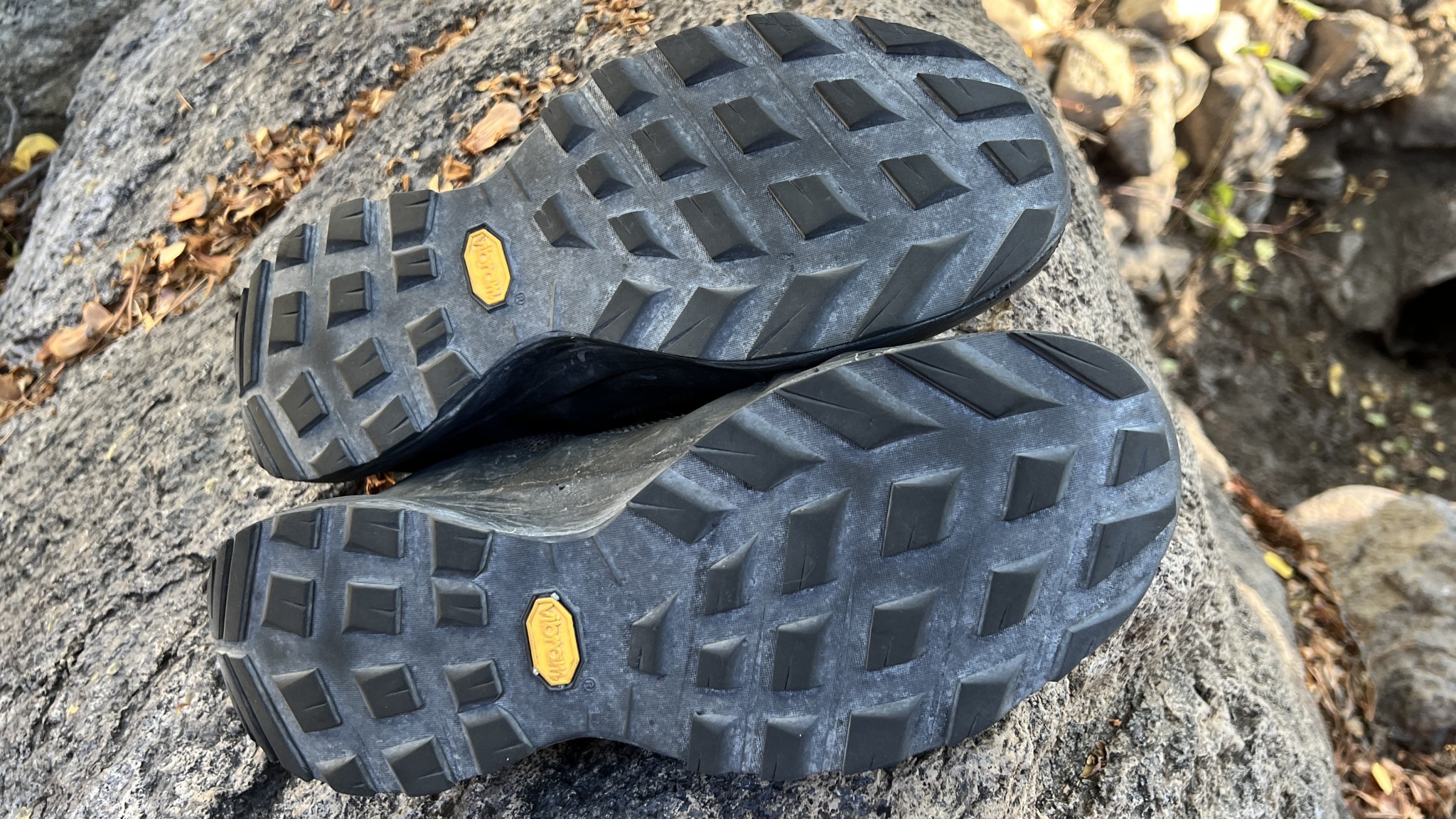 The Vibram Megagrip rubber compound used on the Aerios FL 2 GTX is super grippy and durable. The lugs are shallow and wide, making them quite effective in slabby terrain where more surface contact is needed and reasonably capable in softer, muddy sections of the trail.