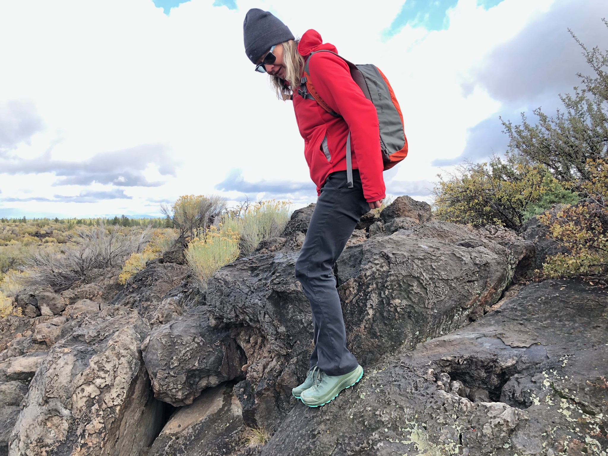 Typically, synthetic hiking shoes are less durable than those that utilize leather in the upper. That being said, the Aerios, while being made entirely of synthetic materials, has proven to be quite durable in rugged conditions. We hiked on lava rocks and trails strewn with craggy basalt boulders and pokey bitterbrush, and there was no visible snagging or abrasion on the uppers. The upper is reinforced, and we did not observe any delamination during our testing period. The rubber toe cap shows some scraping, which is expected and appears to be only cosmetic.