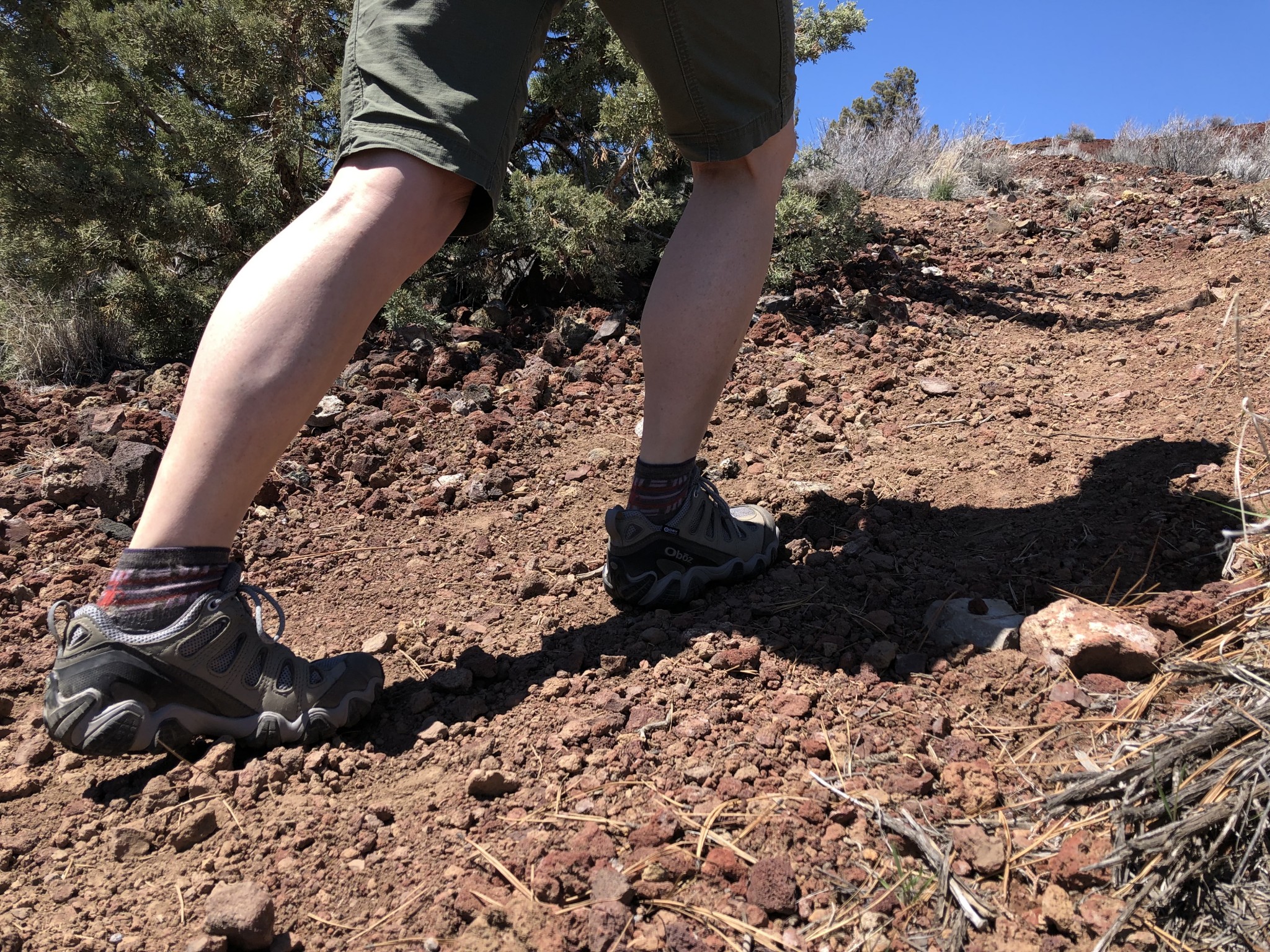 The lugs are chunky, zig-zag shaped, and deep, great for shedding mud and smaller rocks. There is ample rubber on the sides of the shoes for added grip in technical situations. We also appreciate the soft, sticky rubber, which easily grips bare rock. We felt secure underfoot on steep, loose trails and exposed rock and scrambled confidently around on rock bands and cave rims.