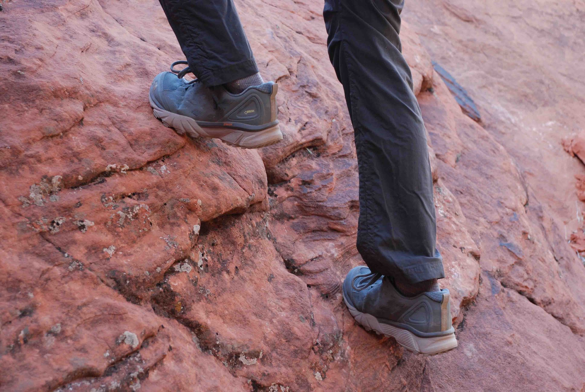 The Endurus has poor traction overall. The thicker midsole makes them a little less sensitive on bare rock, though the rubber on this pair did stick pretty well. The lugs are a little shallow and don't grip well on loose trails though. These are better suited to gentler trails and city walking than a burly mountain adventure.
