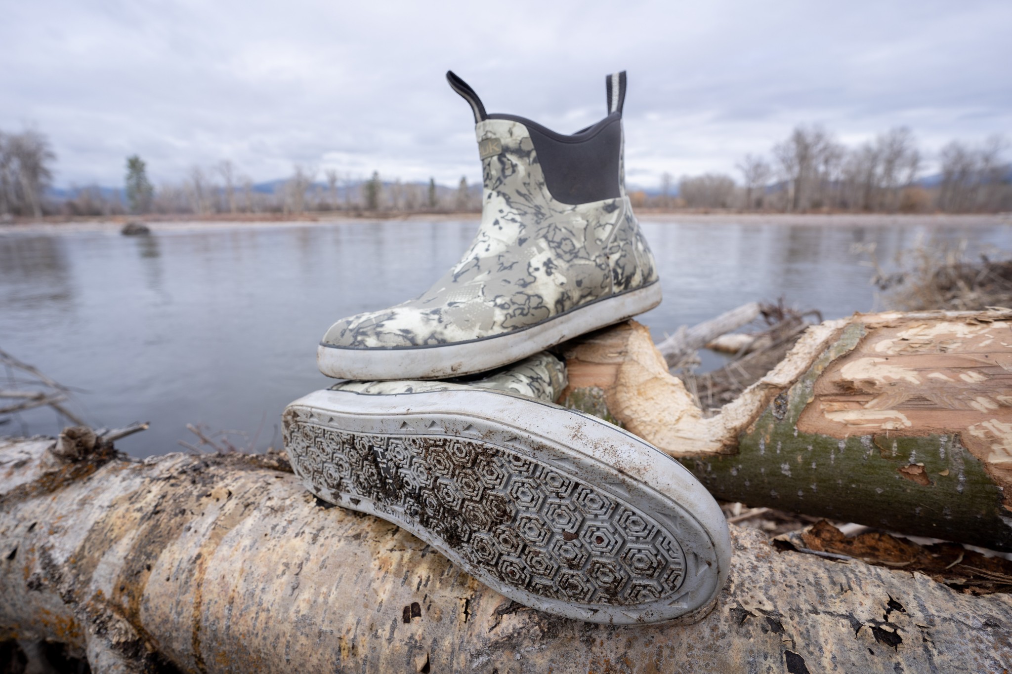 The Huk boots have a shaft height of 6.5 inches, which puts them on the higher side of our low boots. So, while they're not going to keep you dry wading through creeks, they will keep you dry and warm in rain storms and puddles. The neoprene panels on the sides of the ankles are waterproof, too - we even pulled them around underwater with our fingers to make sure no water snuck in.