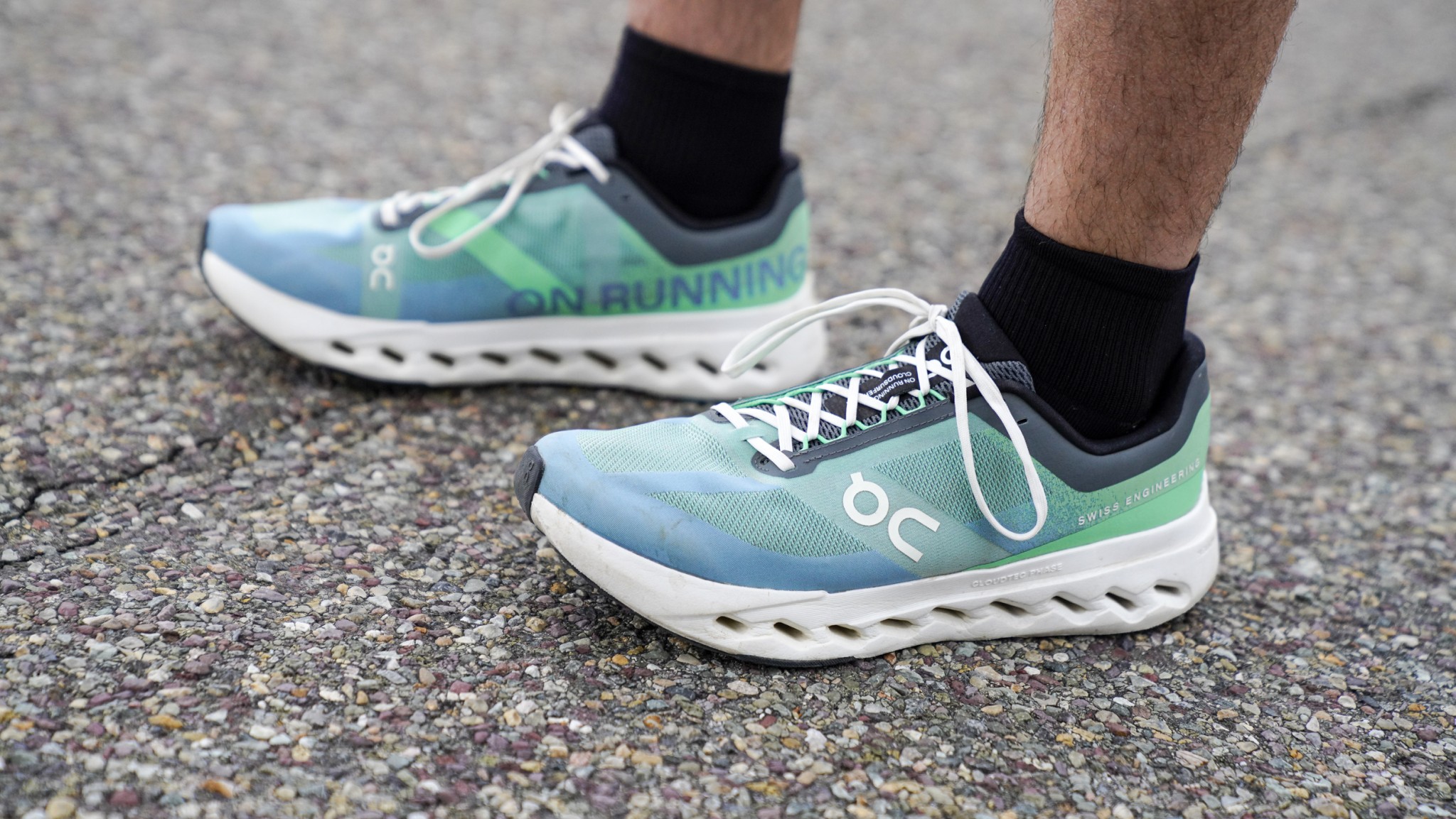 Running in the Cloudsurfer Next is an interesting experience. It rolls extremely well under the foot; we found it had one of the smoothest heel-to-toe transitions in our lineup. On the other hand, the midsole foam itself isn't exceptionally forgiving. It's made of On's Helion foam, which On describes as a “superfoam,” but to our legs, it feels very similar to a standard EVA midsole. There is no noticeable amount of energy return, and the foam feels quite firm underfoot. The firmer foam provides a reasonably stable and supportive platform for runners who prefer to feel planted. The squared-off edges of the shoe can feel like an ankle-roll risk when running on off-camber roads or paths.