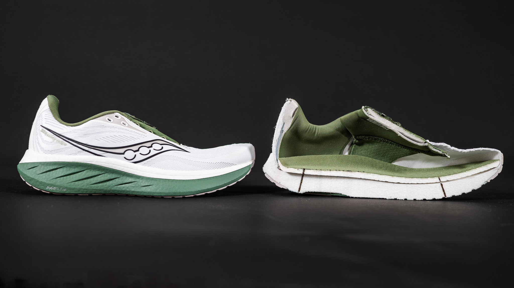 The midsole is made of Saucony's PWRRUN+ foam, which is a beaded TPU. The foam feels insulating and slightly energetic, but lacks bounce compared to premium foam. It doesn't have what we would call an “engaging” or “exciting” running experience. On a scale of very firm (hard rubber) to very soft (marshmallow), we'd place the Ride right about in the middle. It's protective on easy runs, keeping our legs from feeling pounded. The shoe felt smooth as we transitioned from landing to toe-off at slow paces, but felt choppier when we started to increase speed. In our opinion, this limits its versatility, which isn't a significant issue, as it is designed for slow and relaxed running, which it excels at.