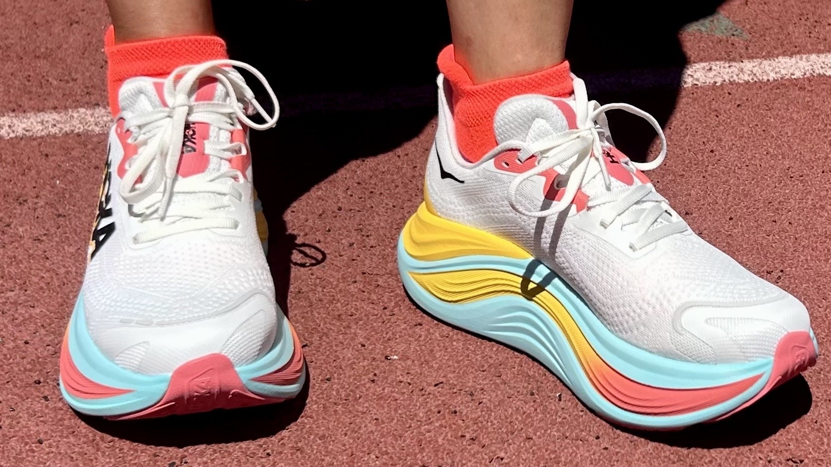 The flat knit upper textile of the Skyward X is breathable and easy to wear. The plump tongue and heel collar provide comfort in addition to security. The midfoot and toe box of the Skyward run slightly narrow. Hoka does not currently manufacture a wide option, so this is worth considering if you know you like a wider shoe.