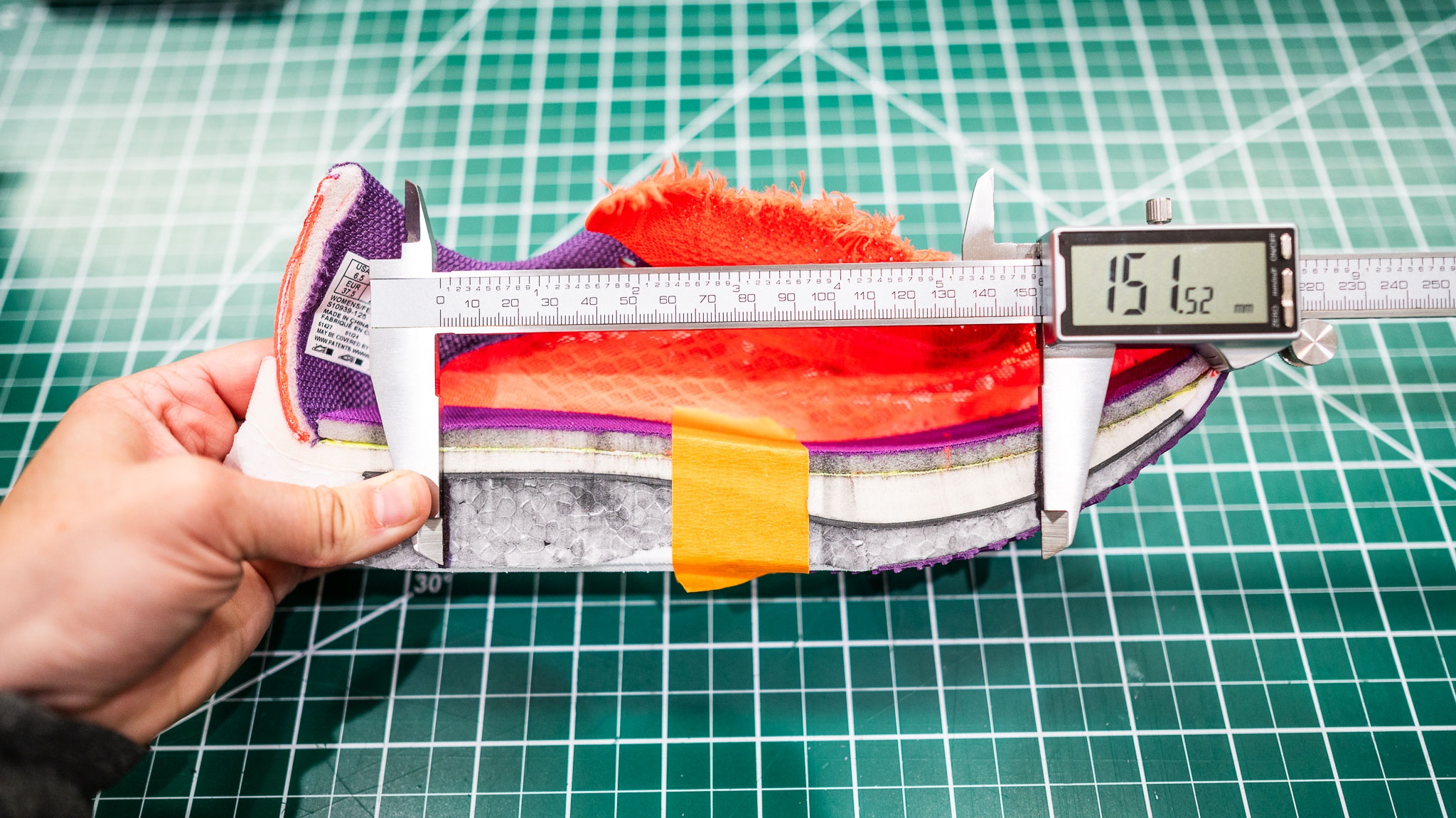 The rocker of the updated Endorphin Pro is wildly aggressive. We measured it at 24.5 degrees, with the apex just 65.4% forward from the heel — among the most aggressive rockers we've tested. This comes together to create the sensation of your feet being pushed toward the front of the shoe as your paces heat up. The updated layering in the midsole provides a strong snap as you bound through your strides.