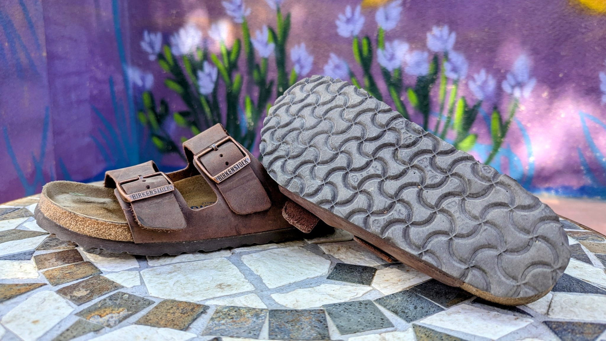 As they are leather, the Arizonas don't do well with water, so I don't like wearing them to the beach or on rainy days. On a rainy day, I tend to select different shoes that handle puddles better. To preserve the life of my Arizonas, I avoid soaking them but also limit sun exposure by storing them indoors. The leather can dry out in the heat, so I wouldn't recommend leaving them outside to bake in the sun. I apply a leather conditioner every few months ( I often walk in moisture-sucking dry deserts) to preserve the suppleness of the upper straps.