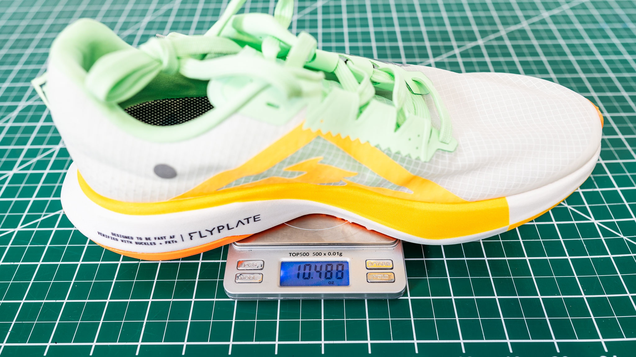 At 10.50 ounces per shoe, in size US men's 10.5, the Nike Ultrafly reduces weight by using a super light upper and Vibram Litebase. While not as light as some of the others we tested, the model still feels very fluid when running fast. Nike uses a unique knit blend around the midsole, which claims increased durability without sacrificing the weight of more durable exteriors.
