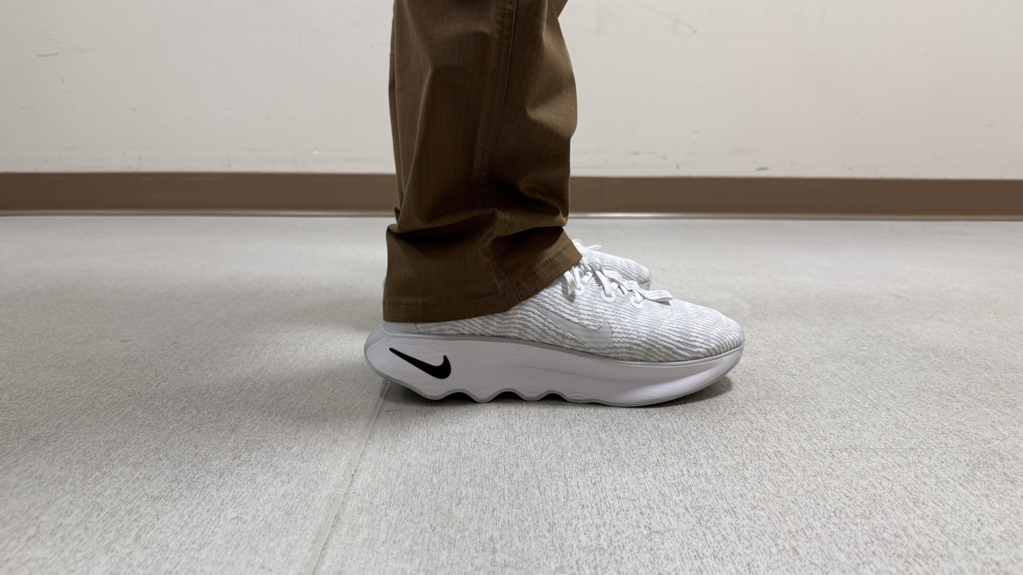 Out of the box, I quickly noticed a very different rocker profile on the Nike Motiva. The rocker starts about halfway down the shoe, appearing almost like a half circle instead of the mostly flat shoes I am used to. The shoe is designed to strike the heel first and then roll forward to the toe for push-off, but the impact was felt closer to the midfoot region. The cushion is thicker in the midfoot in front of the heel, which is likely the reason for that feeling. The shoe required some adaptation during my 10,000-step testing period, and it felt like I had to make a gait adjustment every time I laced them up. The Comfortgroove cushion features an uneven pattern designed to absorb impact on uneven surfaces, with a wavy, uneven appearance. Once we adjusted to the shoe, it felt quite comfortable and offered a lot of cushion; there were no hot spots or pressure areas from the knit mesh upper, which fit snug.