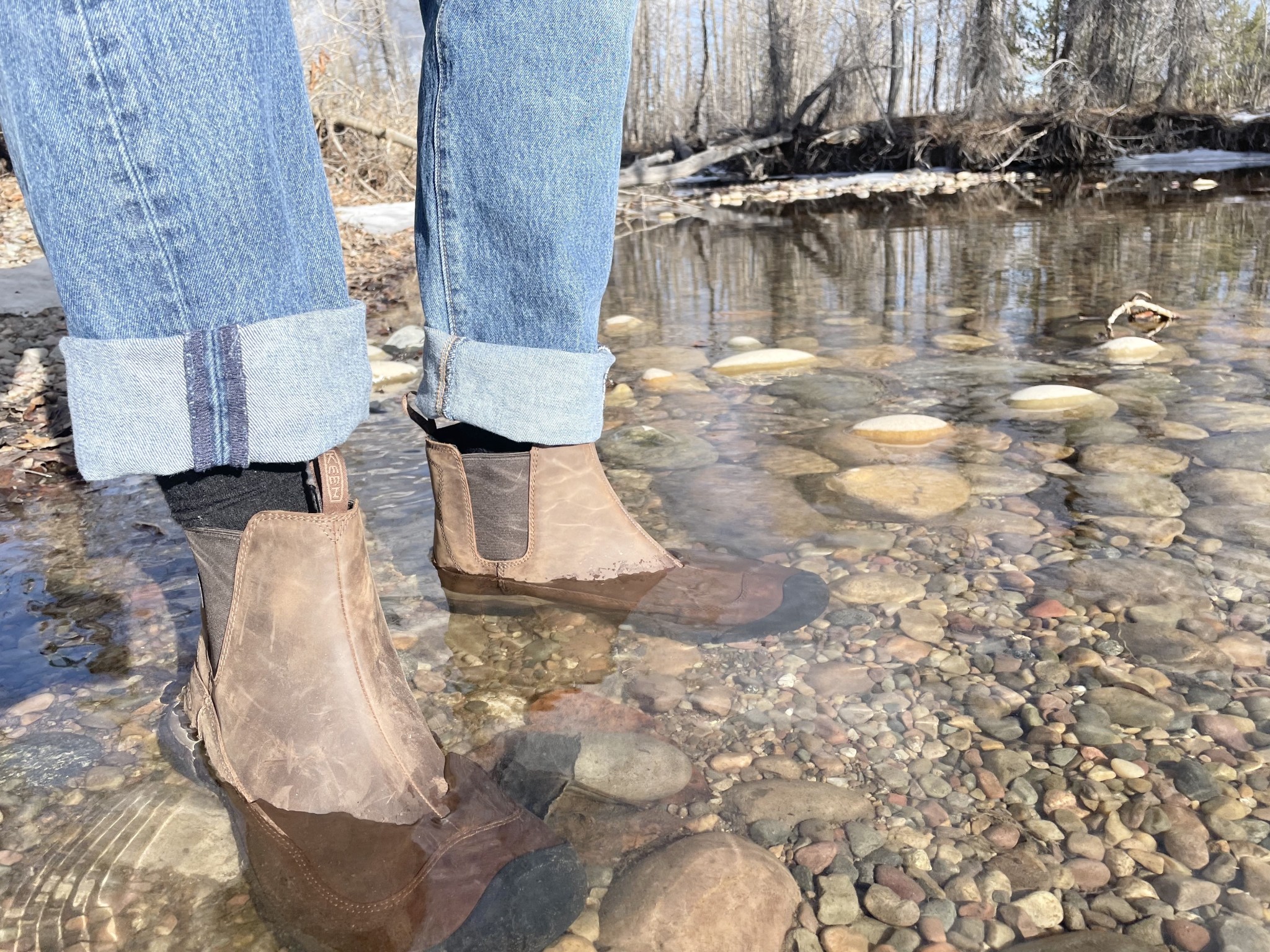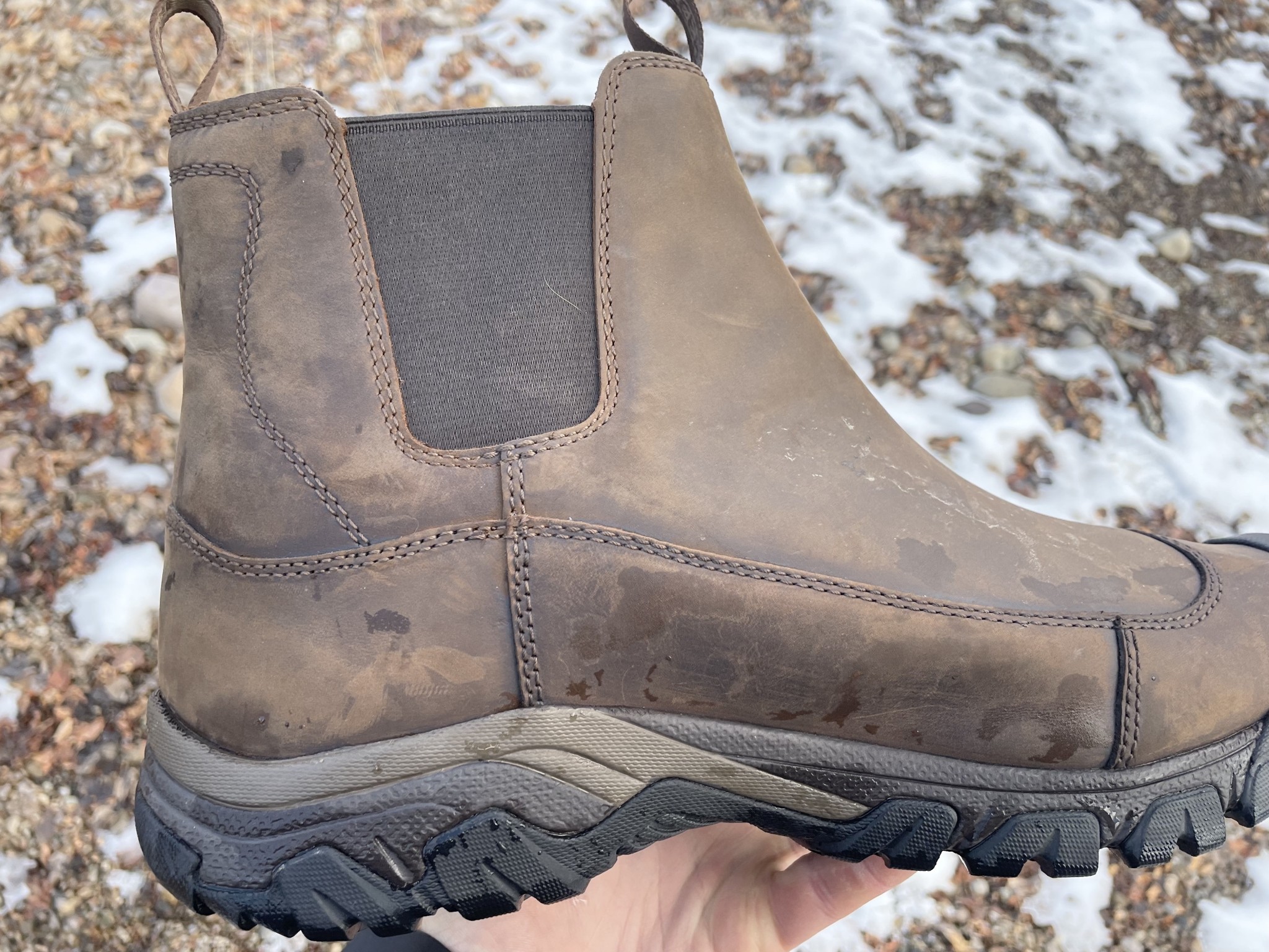 The Anchorage has a tall shaft height compared to other Chelsea boots, but the elastic panel that allows the boot to slide on and off is not waterproof. When we submerged the boots in a creek, water immediately seeped through. On top of that, this material starts only 4 inches off the ground, so if you step in a puddle deeper than that, you'll have wet feet. All Chelsea boots share this weak point, and as a result, they're the least weather-resistant winter boots in our test. That said, the maximum puddle depth before leakage is better in this boot than other Chelsea boots out there.
