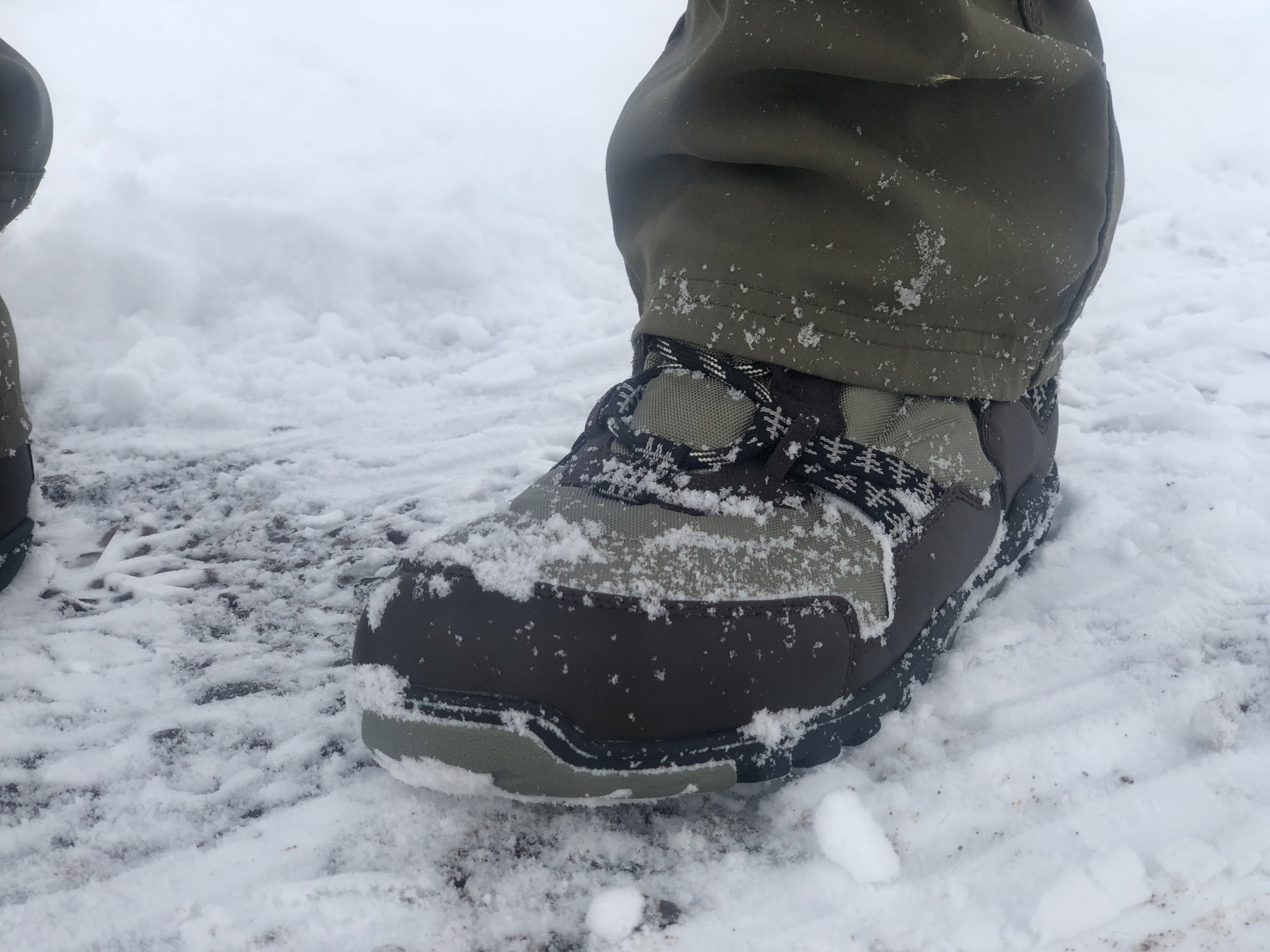 The lugs on this boot are arrow-shaped, numerous, and well-spaced, allowing the sole to bite pretty well into soft snow. We were impressed with the traction on slippery, slushy trails, as well as hardpacked snow.