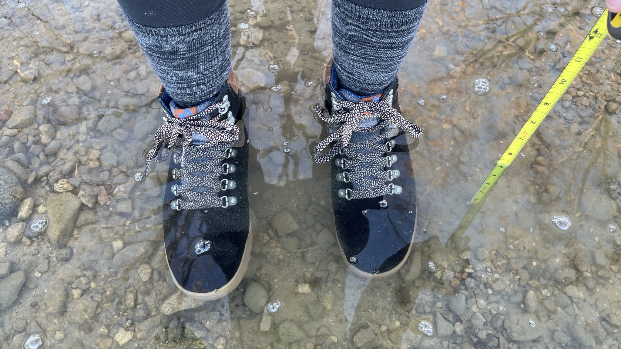 My feet stayed dry in standing water that measured less than 5 inches. At a 5-inch depth, water seeped in slowly, and by 5.5 inches, my feet were wet. Similar results were experienced when testing the Forsake Patch Mid in the snow - they excel on packed snow and through shallow puddles, but in deep water and snow, the relatively short height eventually compromises dry feet.