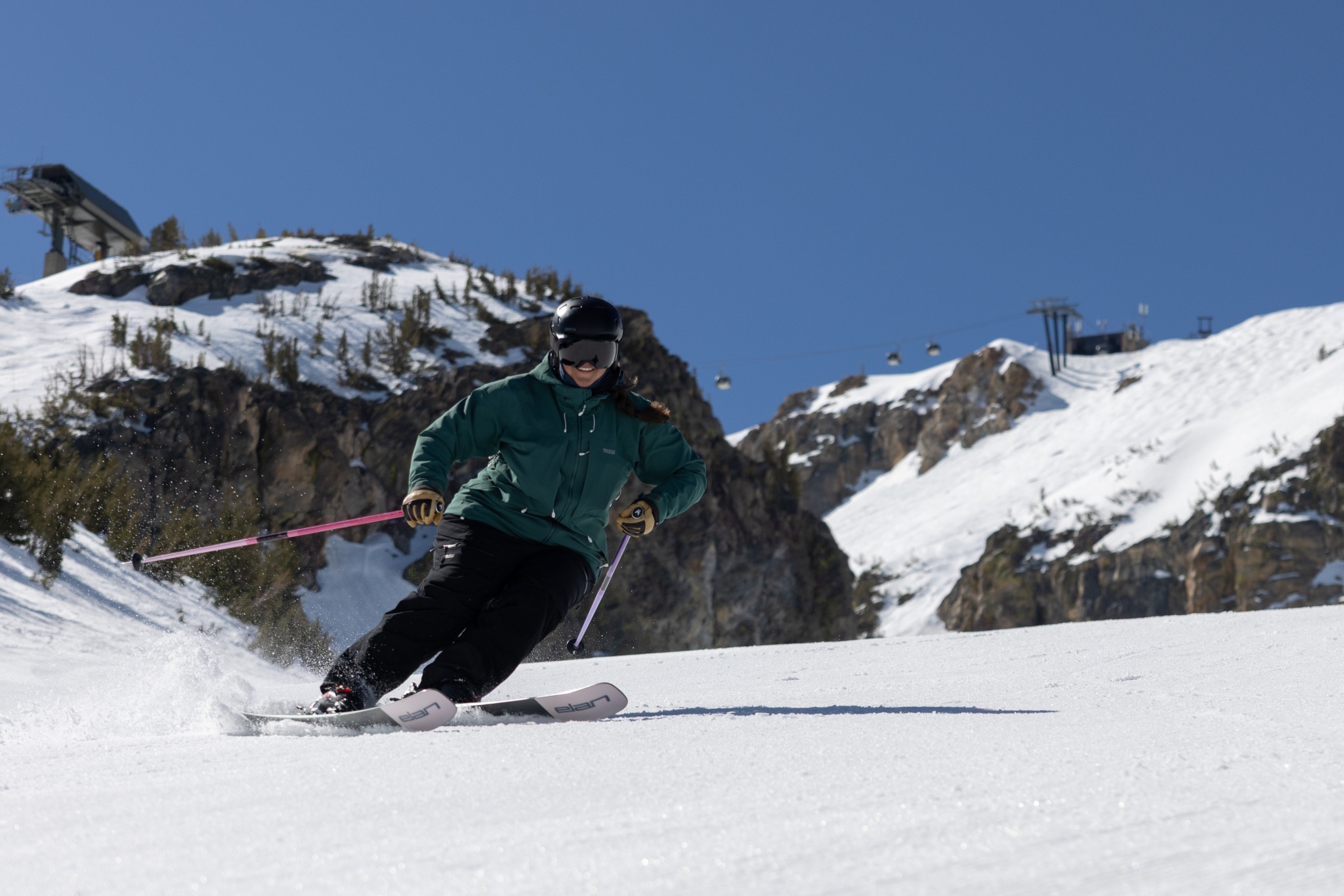 Elan lists the Ripstick 94 W with a 16.8 meter radius, but it skis much tighter than that number suggests. Our team agrees that it feels more like a ski with a zippy, 15-meter radius. The carbon and fiberglass construction allows the ski to bend easily underfoot, creating a lively and intuitive feel that encourages shorter turns with minimal effort.