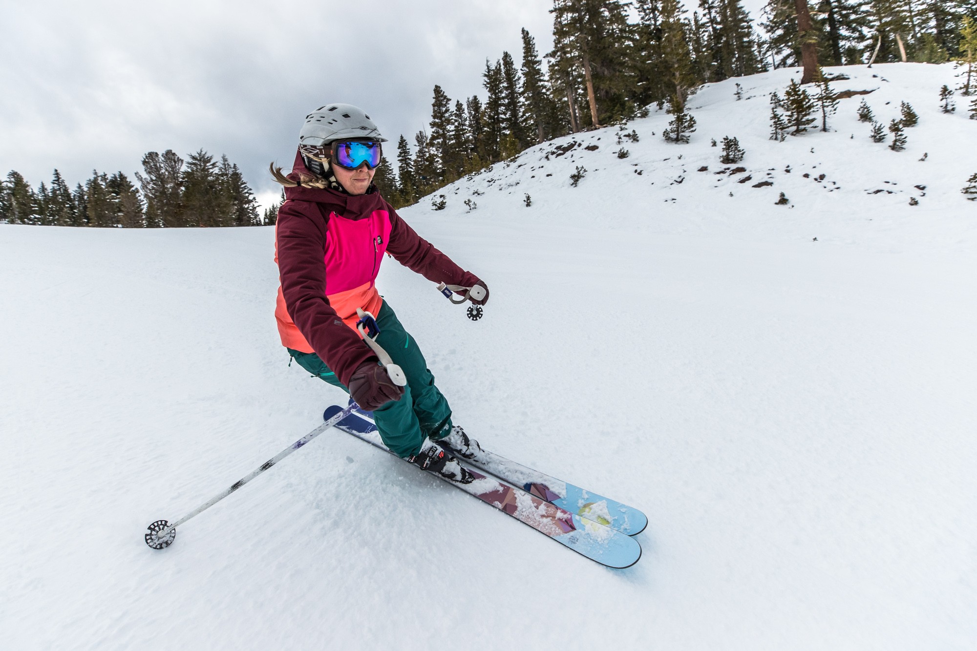 The graphics on these skis are stunning and get compliments on every chair ride. The geometric mountain scene reminded us of one of our favorite local artists here in the Eastern Sierra, Ann Piersall, and made us feel right at home. And we love the fact that they're using Colorado beetle-killed pine to make this ski — way to make lemonade, Icelantic!