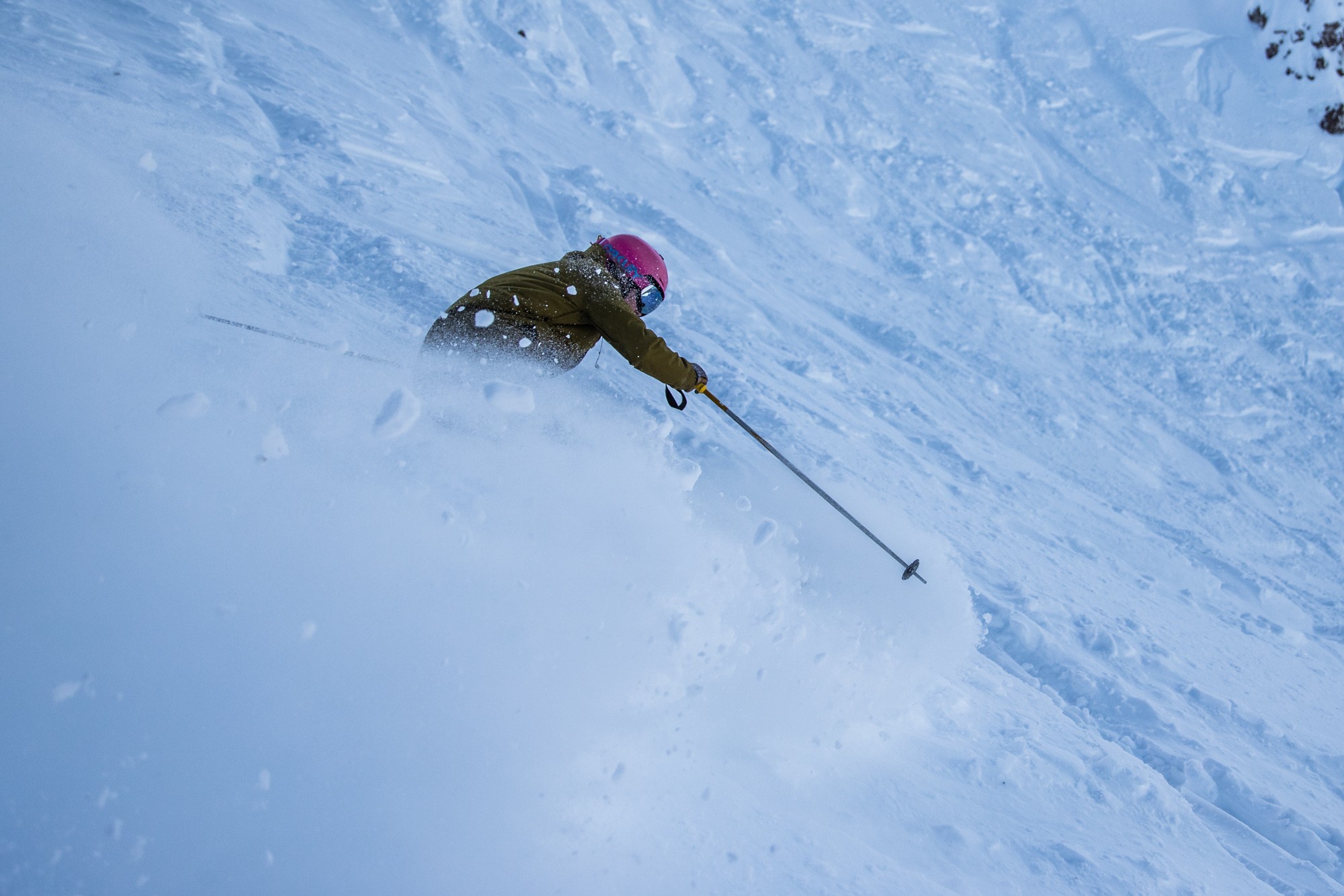 We couldn't believe how much fun we could have on such a fat ski on groomed runs! We found that when we made an effort to flip the ski over quickly, it responded well and rewarded us handsomely for getting a higher edge angle earlier in the turn. When you push it to engage earlier, it can feel like it has a tighter turn radius than 18m. We were thrilled with the rebound it provided when you pressure and then release it just the right moment. It feels like it springboards you into the next turn.