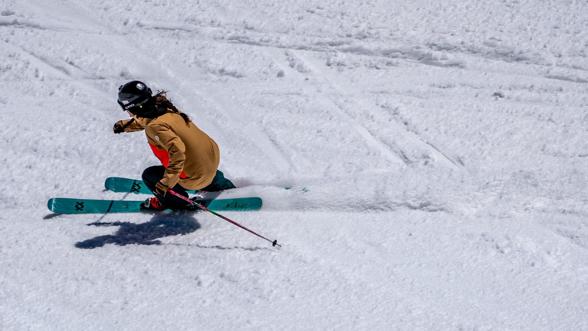 The Secret 96 performs carved turns with a tenacious edge grip and is particularly impressive through medium-to-large radius turns. Although Volkl touts the combination of four different sidecuts comprising their 4-Radius Drive design, our testers all agreed that they could only ever feel one radius through a single turn.