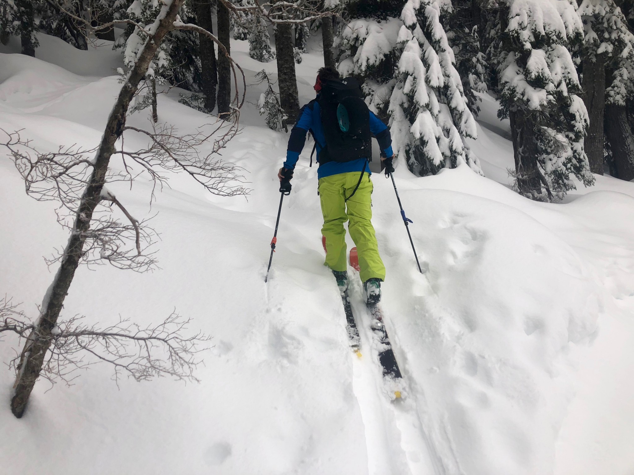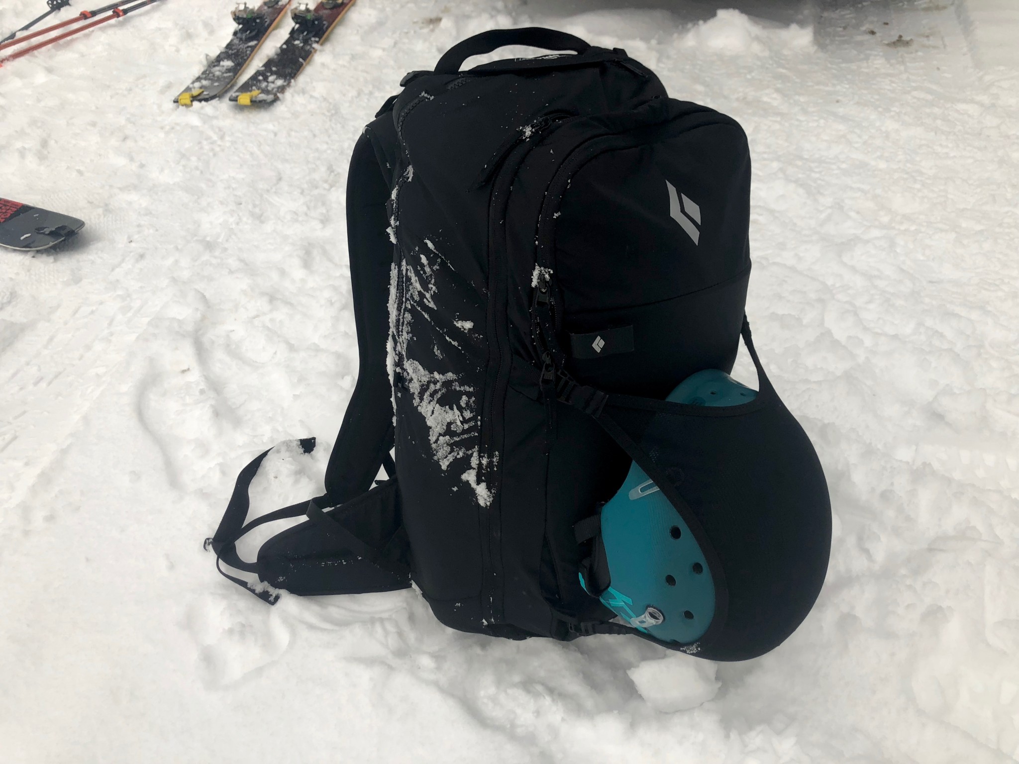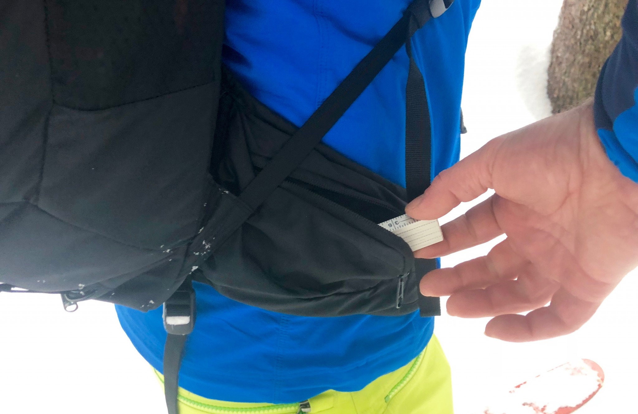 The snow safety gear pocket is gigantic and fits most shovels and probes, including most 300cm lengths. It is just big enough that we could fit our skins inside the pocket, using it as a wet pocket, helping to keep our insulating layers (or extra gloves in the main compartment) dry.