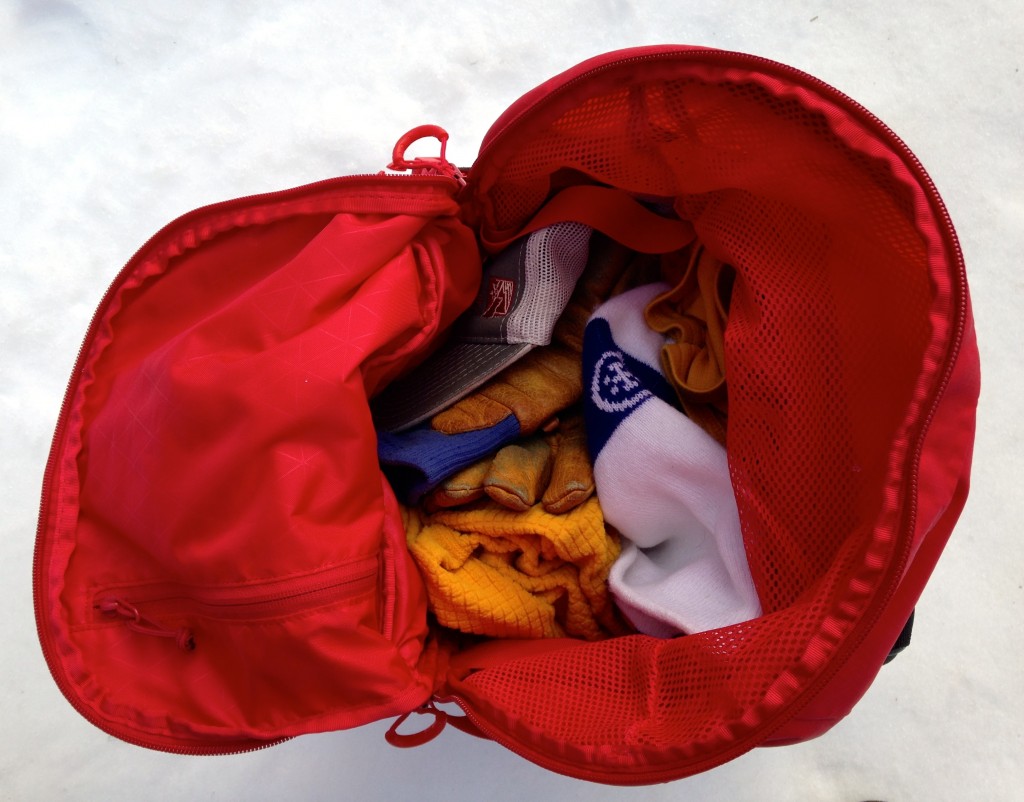 The Saga 40 is a very well-designed pack, especially for the user group it's aimed for. Its only small downfall is its snow safety gear pocket, as it is harder to put your gear back into when your pack is full, say during a midday stability test. The pocket will also fit some larger (300 cm) probes, but not all, and many more average sized shovels, but few larger ones. This pocket is tight enough that we wouldn't plan on shoving your skins in there.