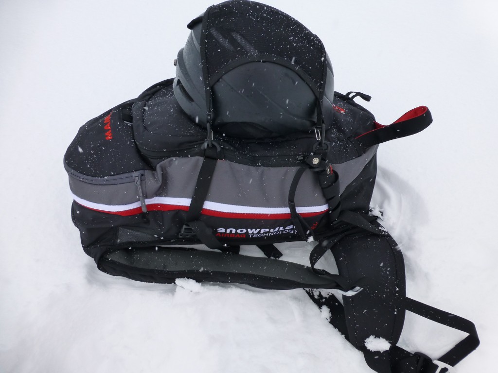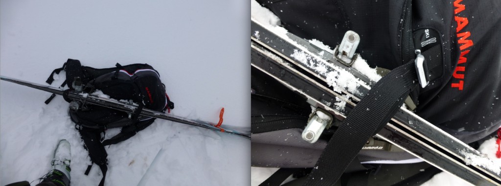 The Pro Protection 3.0, like other Mammut airbag packs, is one of the best options for carrying a snowboard. For skis, they feature a decent (but not excellent) diagonal ski carry system. The upper strap is wide and across the back of the pack so the skis can move around a little. This wasn't as much of a problem for just booting it, but when the terrain got trickier, they moved around more than other airbag packs, like the Backcountry Access Float 32. With the Mammut Pro Protection, it is one of the few airbag packs you can carry skis in an A-frame style, though Mammut does not recommend this for situations where you might want to deploy your bag. A scenario for carrying your skis A-frame could be hiking up through the woods to get to the start of the snow where you can put your skins on.