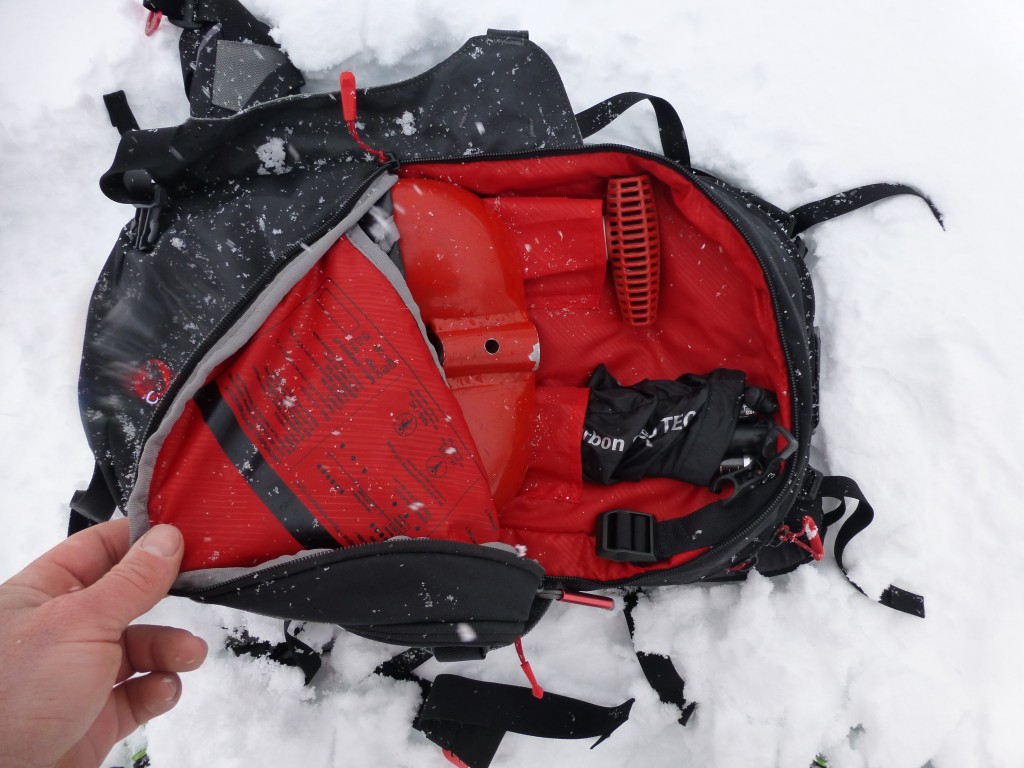 The Ride Removable looks like most “normal” ski packs with a fleece-lined goggle pocket and small zipped space for keys and other small stuff. The snow safety section is nicely organized but small. It will fit everything you need, as long as your shovel handle or probe isn't too long. We appreciate the removal nature of the airbag. It lets you drop a pound and a half for low danger spring skiing, or you can use it as a normal daypack.