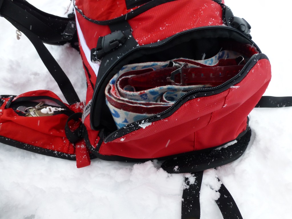 The Ortovox Tour 32 + 7 ABS Pack is one of the better all-day, hut-to-hut and multi-day backcountry packs we tested. It might be a little too compartmentalized for some, but most people will find it well laid out with lots of nice useable features. We quickly learned to love the skin/wet pocket near the bottom of the pack. We typically pack our skins in the saftey gear pocket, which depending on the pack and the size of your shovel can be easy or a big pain. This pocket was plenty big enough to fit skins and they where easy to pack and unpack quickly. Despite having another pocket dedicated to skins, the snow safety pocket was huge and swallowed all of our avy tools with ease. We liked the easily removable helmet carrying mesh attachment as well as the zippered fleece-lined goggle pocket. The zippered mesh pocket on the inside of the giant snow safety gear is great for keys, wallet, cell phone and other items that you don't want to get lost but don't need quick access to. We never found a use for the outermost long skinny pocket, though it is small enough and doesn't add much weight. The waist belt zippered pocket was nice, but we wish it was a little bigger. It is big enough for GU or a cliff bar but won't fit a normal sized candy bar or a small camera. The +7 expandable section is nice and makes the pack feel big enough for longer trips. The Tour 32+7 is the only airbag pack we tested to feature some air ventilation in the back panel.