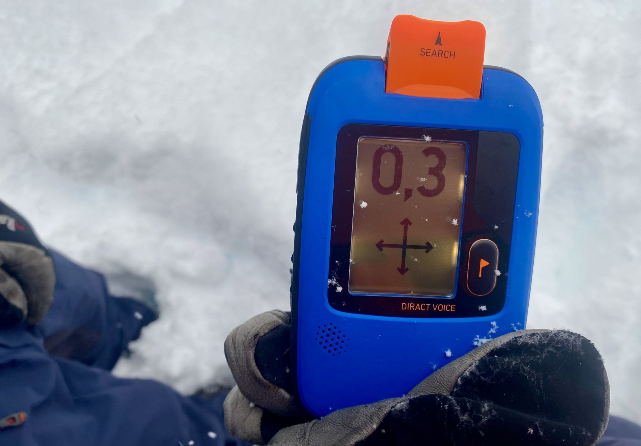 For single and multiple burials, the Diract Voice struggled greatly in our accuracy tests. The initial signal acquisition was challenging, and in the first moments of a coarse search, it struggled to accurately point us in the right direction upon first receiving a signal. In the meat of the coarse search, the signal was stronger, but the directional arrows are more jumpy than other beacons we tested, which led us to slow down to ensure we were going in the right direction. In fine search, we were often .5 to 1 meter away from our target when we reached a low point, which forced more probing to pinpoint our target. This distance isn't too alarming, and ultimately, with good probing technique, is adequate to perform a proper pinpoint search. But compared to all the other beacons in our test, this one put us the furthest away from our target each and every time.