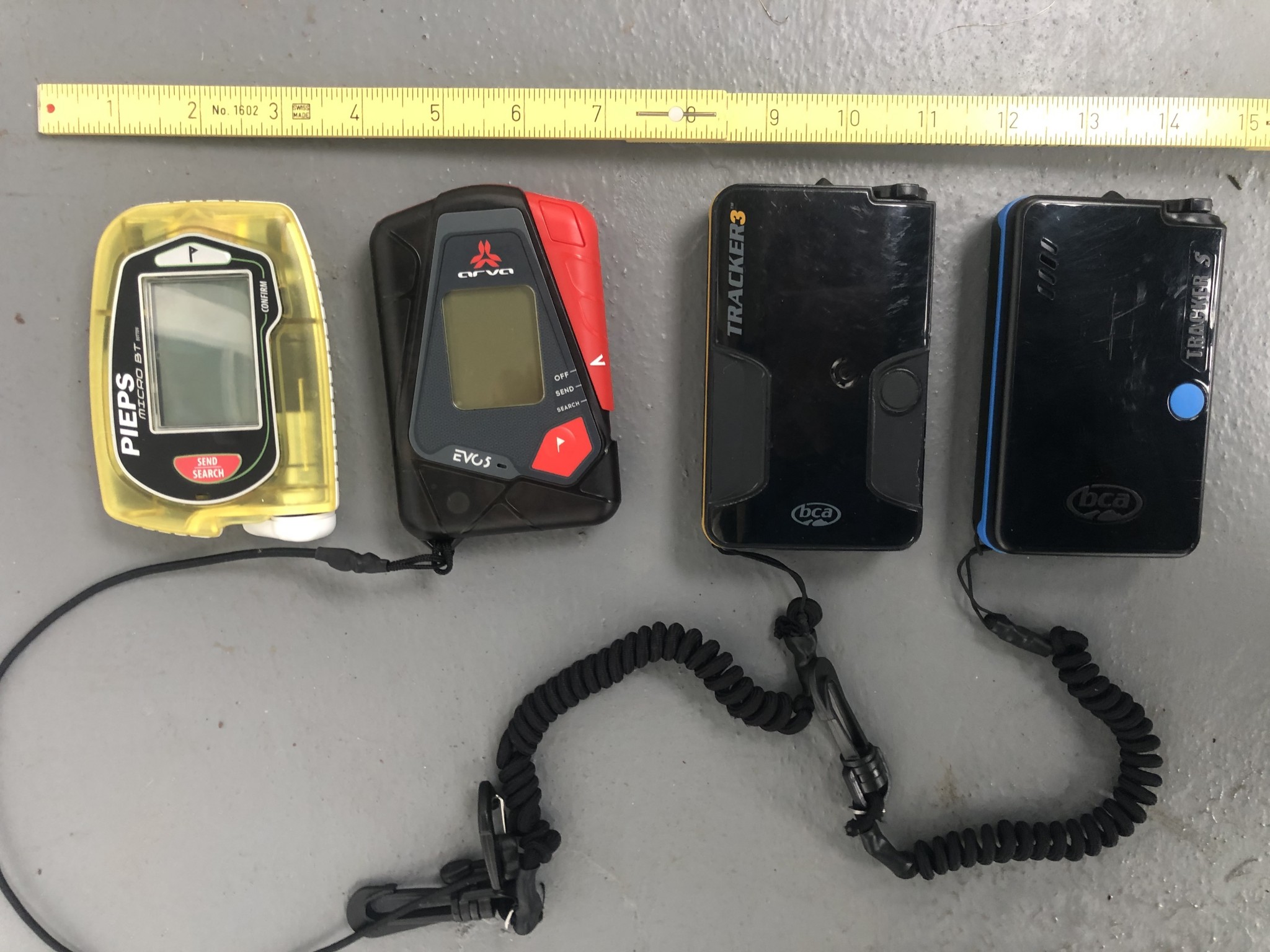 The Peips Micro BT is the smallest triple antenna beacon currently available and is the smallest of the new wave of lower profile beacons. The Peips Micro BT (far left) compared in order from left to right to the Arva Evo5, BCA Tracker3, and Tracker S. Credit: Ian Nicholson