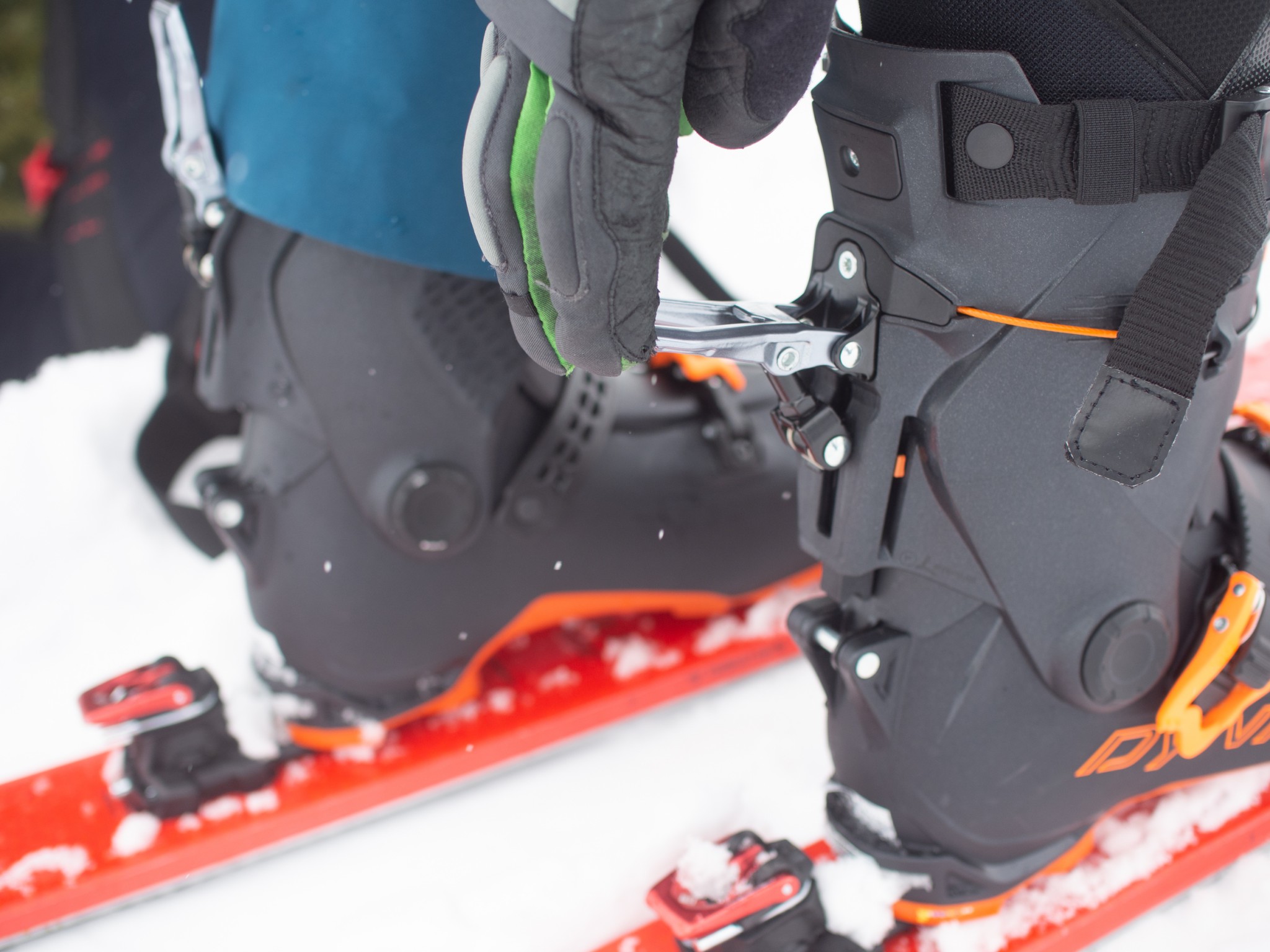 "Uphill performance", in our scoring matrix, is purely a function of cuff range of motion and friction within that range. We score weight elsewhere. In terms of touring cuff range and friction, there are two distinct modes of the Hoji Pro Tour. If used “as designed”, uphill travel is below average. If you use it as most use their boots, uphill performance is about average. Let us elaborate. Dynafit has designed and marketed the Hoji Pro Tour as having a one-step uphill-downhill transition. With their “pants down always” branding and intention, the cuff lock, upper buckle, and power strap are activated and (partially) deactivated all with a mid-sized rear lever. When you adjust everything and use the boots this way, you get a tour mode that works but isn't as free-flowing as other options.
