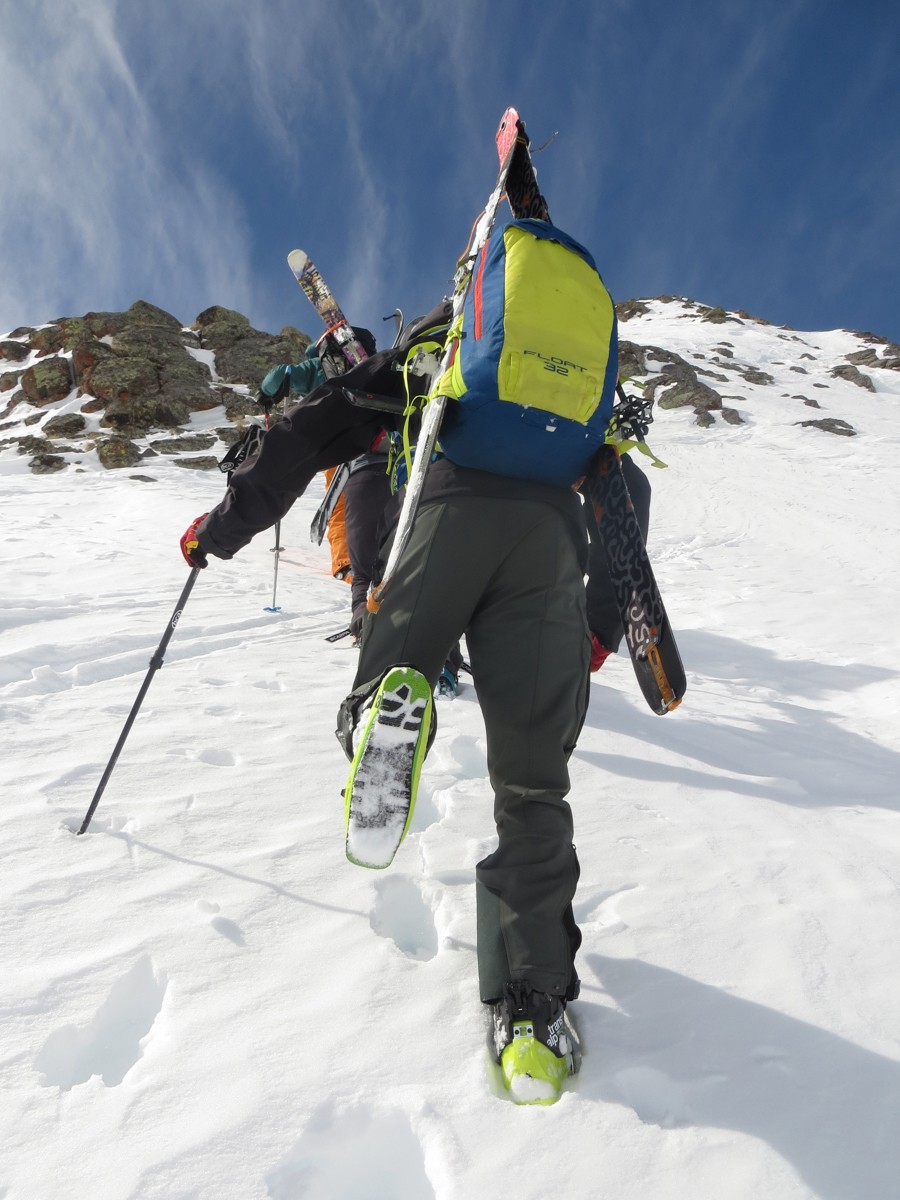 With tongue construction and a less-binding bar-less ski/walk mode switch, we expected the Transalp to tour well. There seem to be three major classes of boots, as it pertains to ankle mobility and therefore up-hill performance. At one extreme are the two-piece, overlap-constructed boots like the Lange XT FreeTour 130 and the Tecnica Zero G Guide. These are essentially alpine boots with a walk mode and “tech fittings”. We don't expect much, in terms of ankle mobility from these. In the middle are “three piece” or tongue boots, with a bar-and-pin ski/walk mode lock. In these boots the lower boot (scaffo, in Italian) and cuff are locked together with a metal bar and pin that slides into a hole in that metal bar. When unlocked the metal bar slides back and forth, adding friction but allowing movement. At the other end of the spectrum are the boots that are constructed in three piece or tongue style, but have a lock mode that doesn't require a metal bar.